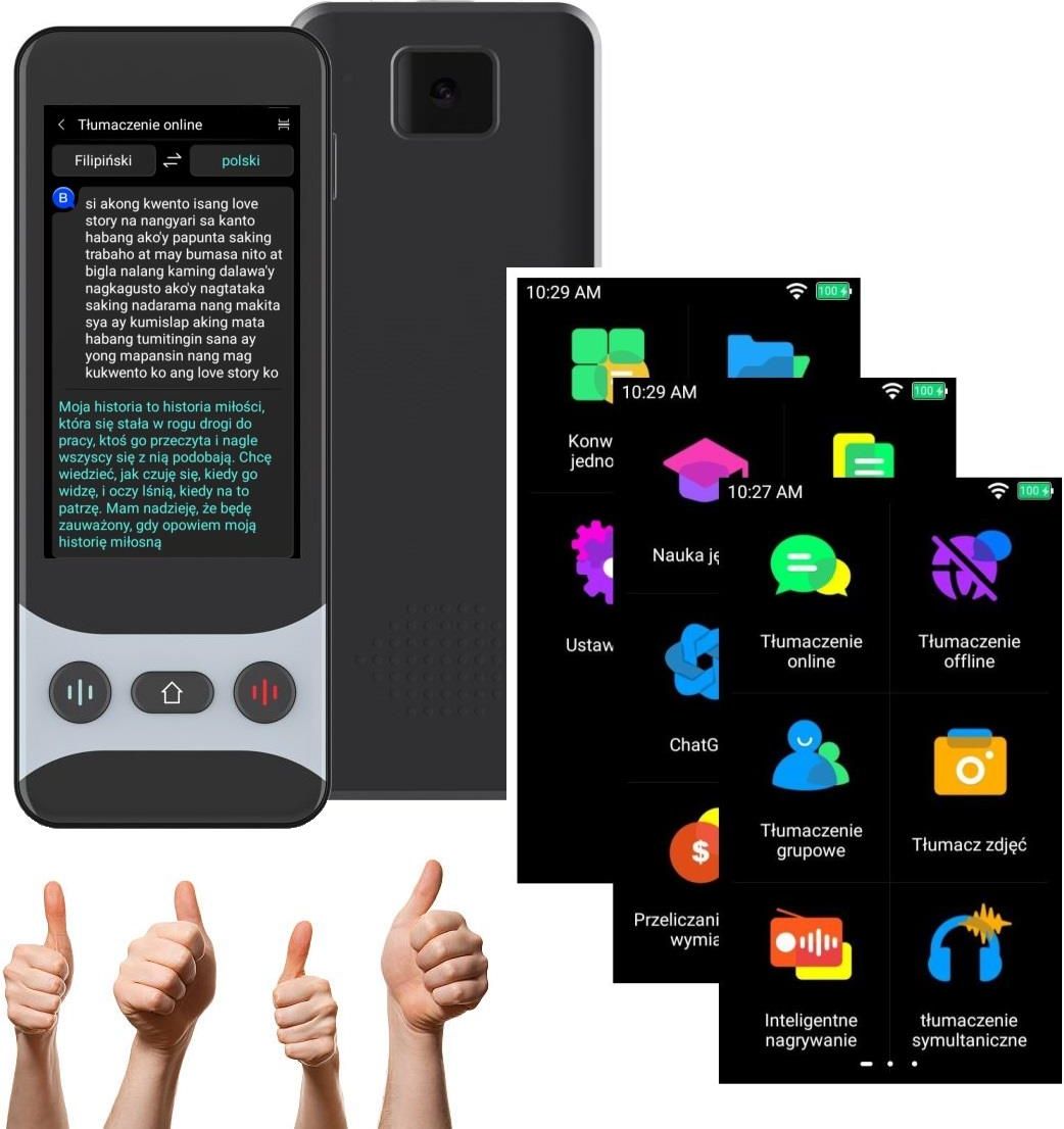 Translator elektroniczny Chipol J6P z offline polskim Przedstawiamy jeden z najnowocześniejszych tłumaczy elektronicznych na rynku. Do każdego translatora gratis pendrive !!! Dzięki translatorowi JP6 masz możliwość rozmowy w 138 językach i ich odmianach. Gdybyś jednak nie miał dostępu do internetu, również możesz rozmawiać, choć tylko, lub aż w 21 językach. W trybie offline jest dostępny język polski bazowany na wewnętrznym, stale aktualizowanym słowniku wyrazów. Translatora Chipol JP6 możesz używać bez dostępu do internetu, w środku puszczy, na pustyni lub na ulicach Indii.Dodatkowo możesz tłumaczyć zdjęcia i obrazki, również bez dostępu do internetu w 33 językach !!! NIE MA OGRANICZEŃ JAK INNE TRANSLATORY !!! Spośród innych tłumaczy elektronicznych wyróżnia się szybkością pracy oraz małym rozmiarem, co ułatwia posługiwanie się nim w różnych okolicznościach. Niewielkie wymiary i mała waga w połączeniu z niezawodnym silnikiem tłumaczeniowym, który charakteryzuje szybkość oraz wysoka skuteczność, czynią ten model tłumacza niezastąpionym narzędziem w każdej podróży i konwersacji międzynarodowej. Intuicyjna obsługa translatora przy pomocy dwóch przycisków oraz ekran dotykowy, pozwala używać ten model nawet dużemu dziecku. Translator Chipol JP6 ma wyraźny, czytelny wyświetlacz z dużą jasnością, elegancką i stylową obudowę oraz lekką, kompaktową konstrukcję. Takie połączenie funkcjonalności i właściwości, idealnie podkreśla użyteczność w podróży. Oferuje szybsze, płynniejsze tłumaczenie, zapewniając bezproblemowe działanie z lub bez internetu. Korzystanie z translatora J6P to ekscytujące doświadczenie, nauka i zabawa w jednym. Dodatkowe funkcje, m.in. tłumacz elektroniczny oferuje tłumaczenie grupowe, umożliwiając tworzenie czatów z zagranicznymi znajomymi lub współpracownikami za pośrednictwem ich numerów identyfikacyjnych. Dzięki aż 138 językom online i 21 językom offline, w tym tłumaczenie zdjęć offline, translator J6P ma szerokie możliwości, które zaspokoją Twoje indywidulane potrzeby. Bądź pewien, że zastosowano polskie menu dla Twojej wygody. Jesteś zagranicznym studentem? Translator J6P to Twój idealny towarzysz, niezależnie o czasu i miejsca ! Masz problemy z nauką języka? Translator JP6 będzie Twoim najlepszym przyjacielem ! Planujesz podróż? Translator J6P jest kompaktowy i przenośny, mieści się w kieszeni ! Chcesz cieszyć się zakupami za granicą? Translator J6P przełamie wszelkie bariery językowe ! Nadal nie jesteś pewien, czy J6 Translator jest dla Ciebie?Poznaj moc naszego najnowszego translatora? Sprawnie obsługuje wszystkie Twoje potrzeby tłumaczeniowe, Obsługując szeroką gamę języków, zapewnia bezproblemową komunikację, Zawiera obsługę ChatGPT! Tak, dobrze przeczytałeś — ChatGPT ,jest zintegrowany z systemem. KUP TERAZ I PRZEKONAJ SIĘ SAM! Ciesz się bezproblemowymi rozmowami każdego dnia! W zestawie: translator elektroniczny J6P, instrukcja polska i angielska, kabel zasilający, pasek do translatora. Niezależnie od tego, czy prowadzisz biznesowe negocjacje, czy nawiązujesz kontakt z osobami z różnych kultur, Translator J6P zapewni Ci płynną komunikację. Dzięki wysokiej jakości rozpoznawania mowy i wsparciu dla idiomów i słownictwa specjalistycznego, możesz być pewien dokładnego tłumaczenia. Lista dostępnych języków offline POLSKI, angielski, arabski, chiński, czeski, francuski, hinduski, hiszpański, holenderski, indonezyjski, japoński, koreański, mandaryński, niemiecki, portugalski, rosyjski, tajski, turecki. ukraiński, wietnamski, włoski. Translator Chipol J6P to niezastąpione narzędzie podróżne. Pozwala na łatwą konfigurację i dostęp do różnych ustawień. Z jego kompaktowymi wymiarami i lekką konstrukcją, możesz go zabrać ze sobą wszędzie, aby mieć pewność, że zawsze będziesz gotowy do porozumienia się w obcym języku. Nie trać więcej czasu na trudne i niepewne tłumaczenia. Wybierz translator J6P i ciesz się prostą i skuteczną komunikacją w każdej sytuacji. Dostępne języki online to - lista wg alfabetu angielski (Australia, Filipiny, Irlandia, Kanada, Nowa Zelandia, Republika Południowej Afryki, Stany Zjednoczone, Wielka Brytania), arabski (Algieria, Arabia Saudyjska, Egipt, Irak, Kuwejt, Liban, Maroko, Zjednoczone Emiraty Arabskie), bengalski, birmański, bułgarski, chiński (kantoński, tradycyjny, uproszczony), chorwacki, czeski, duński, fiński, francuski (Francja, Kanada), grecki, hebrajski, hindi, hiszpański (Argentyna, Boliwia, Chile, Ekwador, Gwatemala, Hiszpania, Honduras, Kolumbia, Kostaryka, Meksyk, Nikaragua, Panama, Paragwaj, Peru, Urugwaj), holenderski, indonezyjski, japoński, jawajski, kataloński, khmerski (Kambodża), koreański, laotian (Laos), litewski, łacina (Serbia), łotewski, malajski, mongolski, nepalski, niemiecki, norweski, perski (Iran), polski, portugalski (Brazylia, Portugalia), rosyjski, rumuński, słowacki, słoweński, suahili (Kenia), szwedzki, tagalog (Filipiny), tajski, tamilski, turecki, ukraiński, urdu, węgierski, wietnamski, włoski. Specyfikacja model: J6P jednoczesna, dwukierunkowa translacja językowa online i offline, 138 obsługiwanych języków (w tym odmiany), 21 obsługiwanych języków offline, w tym polski, 33 obsługiwanych języków do rozpoznawania foto, język polski w menu translatora, wyraźny, jasny ekran, płynna regulacja wielkości czcionki, wygodna, szybkość (nawet 0,3s) i prostota w użyciu, tłumaczy skomplikowane frazy, zdania w codziennego życia oraz pojedyncze słowa, charakteryzuje się wysoką dokładnością rozpoznawania mowy (do 98% online, do 90% offline), obsługa idiomów i słownictwa specjalistycznego (on line), nie wymaga instalacji żadnej aplikacji. wymagane podłączenie do Wifi - dostęp do internetu - dla obsługi języków online, języki offline - można używać b