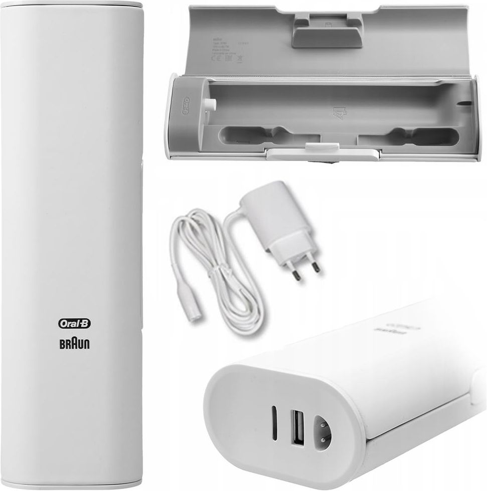 Oryginalne Etui z Ładowarką dla Szczoteczek Oral-B Podróżne etui z funkcją ładowania dla szczoteczek elektrycznych Oral-B to idealne rozwiązanie dla osób, które często podróżują i chcą mieć swoją szczoteczkę zawsze pod ręką. Eleganckie i praktyczne etui zaprojektowano specjalnie do przechowywania oraz ładowania szczoteczki, zapewniając ochronę oraz wygodę użytkowania w każdej sytuacji. Pasuje do większości modeli Oral-B Etui jest kompatybilne z szeroką gamą modeli szczoteczek Oral-B, takich jak: Genius, PRO, Vitality, Smart, TriZone, Smart 1000-6000, Genius X, iBrush, Triumph oraz wiele innych. Dzięki dedykowanej przestrzeni, etui pomieści rękojeść szczoteczki oraz dwie wymienne końcówki, co pozwala na bezpieczne przechowywanie i transport. Produkt nie jest kompatybilny z modelami serii iO. Ładowanie w podróży Etui nie tylko chroni Twoją szczoteczkę, ale również umożliwia jej ładowanie – zarówno szczoteczki, jak i smartfona! Wystarczy podłączyć przewód USB, a szczoteczka będzie gotowa do użycia zawsze, gdy tego potrzebujesz. Łatwe w utrzymaniu czystości Etui oraz akcesoria można myć w zmywarce, co zapewnia wygodę i higieniczne użytkowanie na co dzień. Zestaw zawiera Oryginalne etui Oral-B (7 cm x 23,5 cm) Ładowarka kompatybilną z etui Etui pasuje od modeli AdvancePower Kids 950 (D10, D10.5) Smart 4 Smart 5 Smart 1000-6000 Smart Teen Smart Junior Smart Professional Genius 6000 Genius 7000 Genius 8000 Genius 9000 Genius 10000 iBrush 8000 iBrush 9000 iBrush 10000 Smart 6000 Smart 7000 Pro 6000 Pro 7500 Genius X PRO 3000 PRO 4000 PRO Trizone 5000 Pro 5000 Smart Series 1000 Smart Series 4000 Smart Series 5000 Smart Series 6000 iBrush 5000 Pro 500, Pro 600, Pro 650, Pro 700, Pro 750, Pro 800, Pro 900, Pro 1000, Pro 1700, Pro 2000, Pro 3000, Pro 4000, Professional Care 500, Professional Care 600, Professional Care 700, Professional Care 1000, Professional Care 1500, Professional Care 2000, Professional Care 3000, Precision, DeepSweep Triaction 1000 Triumph 5000 (model D34.5) oraz Triumph 5500 Pro 4000, Pro 5000, Pro 5550, Pro 6000, Pro 6500, Pro 7000, SmartSeries 4000, SmartSeries 5000, SmartSeries 6000, SmartSeries 6400, Trizone 6000, Trizone 6500, Trizone 7000, Pro 6000 SmartSeries, Trizone 6000 SmartSeries, Black 7000, Black 7000 Trizone, White 7000, White 7000 SmartSeries, Black 6500, White 6500, DeepSweep 5000, DeepSweep 5550 Pro 2, Pro 1000, Pro 1500, Pro 2000, Pro 3000, Pro 4000 Trizone 400, TriZone 500, TriZone 550, TriZone 600, TriZone 650, TriZone 700, Professional Care 5000, Professional Care 5500, Professional Care 6000, Professional Care 6500, Professional Care 450, Professional Care 500, Professional Care 550, Professional Care 650, Pro 400, Pro 450, Pro 500,Pro 600, Pro 650, Pro 700, Junior PRO500, Vitality, Stages Power, TriZone, Pro Health Jr. PRO100, Vitality, Vitality 100, Vitality Plus