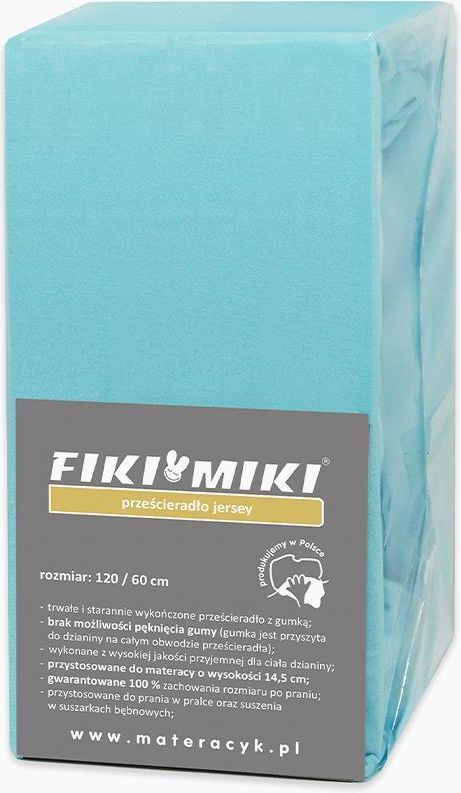 Fiki Miki Prześcieradło Jersey 140x70 miętowe Prześcieradło powinno być właściwie dopasowane do materaca. Wiele osób nie zwraca na to uwagi przy zakupie. W trakcie użytkowania jednak, bardzo często okazuje się, że prześcieradło jest za małe. Jest to nie tylko niewygodne, ale może to być również niebezpieczne. W okresie pionizowania postawy i stabilizowania pierwszych kroków zbyt małe, zsuwające się z materaca prześcieradło może zawinąć się wokół nóg dziecka i spowodować, że Dziecko straci równowagę. Prześcieradła Fiki Miki przystosowane są do wysokich materacy (14 cm). Wykonane są z delikatnych, polskich dzianin bawełnianych (jersey i frotte). Dostępne w modnych kolorach białym, błękitnym, kremowym, lawendowym, miętowym, różowym, szarym i turkusowym. Prześcieradła Fiki Miki są: wyprodukowane w Polsce; wykonane z wysokiej jakości dzianiny 100 % bawełnianej; przystosowane do wysokich materacy (do 14,5 cm); przystosowane do prania w pralce oraz suszarkach bębnowych; gwarantują 100% zachowania rozmiaru po praniu; trwale i starannie wykończone prześcieradło z gumką (gumka przyszyta jest do dzianiny na całym obwodzie prześcieradła, nie pęka); 5902686309284