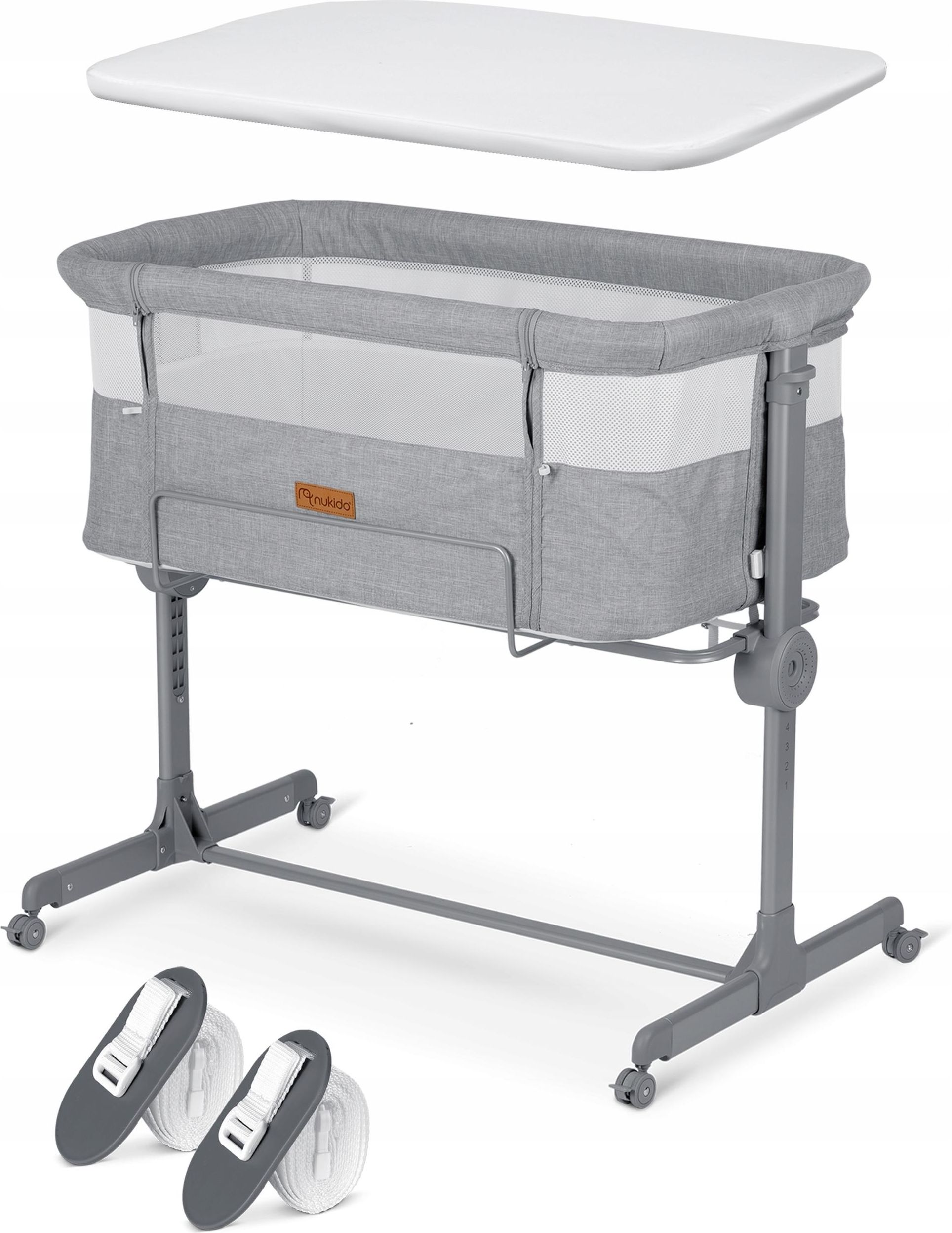 Łóżeczko dostawka Nukido z pasami mocującymi i regulacją wysokości Komfortowe i funkcjonalne składane i lekkie, odpinane boczne wejście do dostawienia, subtelna, stonowana kolorystyka, niezależna dwustronna regulacja wysokości. Bezpieczne stabilna i zabezpieczona konstrukcja, 4 kółka z hamulcem. …
