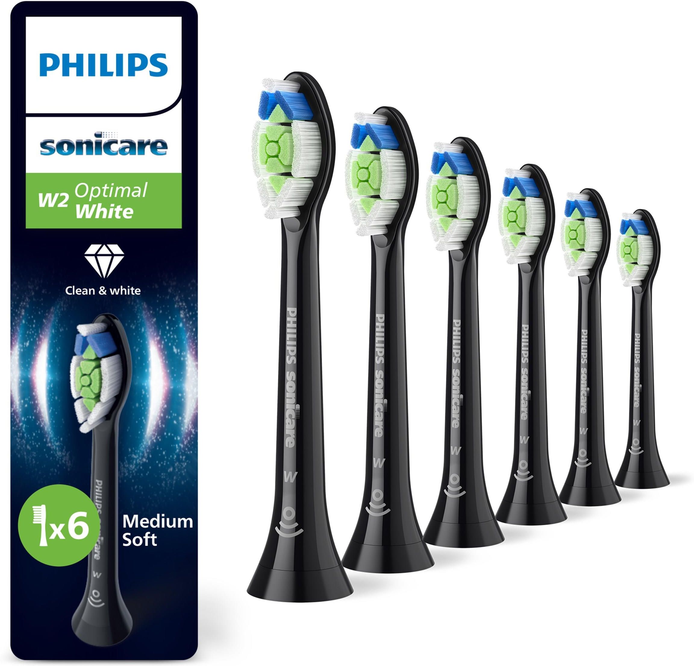 PHILIPS Sonicare Optimal White W2 HX6066/88 czarny 6szt. Główka szczoteczki zapewniająca doskonałe wybielanie.  Osiągnij bardziej promienny uśmiech dzięki tej klinicznie przetestowanej główce szczoteczki Philips Sonicare do wybielania zębów.Zauważ rezultaty już po tygodniu, ciesząc się wyjątkowym codziennym czyszczeniem. Usuwanie do 100% więcej przebarwień w ciągu zaledwie 1 tydzień* Bielsze zęby są w zasięgu ręki dzięki centralnej nakładce do usuwania przebarwień. Włókna w kształcie rombu zostało zaprojektowane tak, aby zwiększyć kontakt z powierzchnią i skuteczniej usuwać przebarwienia. Rezultaty mówią same za siebie - do 100% bielsze zęby w zaledwie tydzień*. Usuwa do 7 razy więcej płytki nazębnej niż zwykła szczoteczka do zębów Nasza wybielająca końcówka szczoteczki wykorzystuje zaawansowane włókna, aby usunąć do 7x więcej płytki bakteryjnej niż szczoteczka manualna, jednocześnie zapewniając odświeżające czyszczenie całej jamy ustnej. Udowodniona technologia Sonicare Poznaj czystość wybraną przez miliony. Szczoteczki Philips Sonicare czyszczą delikatnie, ale skutecznie i dbają o zęby i dziąsła, wykonując do 62000 ruchów włosia. Funkcja Sonicare Fluid Action wspomaga czyszczenie, wprowadzając płyn głęboko między zęby i wzdłuż linii dziąseł. Udowodniona skuteczność w pielęgnacji jamy ustnej Wszystkie końcówki szczoteczek Philips Sonicare są starannie projektowane i testowane klinicznie. Dzięki temu możesz mieć pewność, że spełniają najwyższe standardy jakości, bezpieczeństwa i skuteczności. Szczotkuj jak najlepiej dzięki przypomnieniom BrushSync Czy wiesz, że główki szczoteczki stają się mniej skuteczne po trzech miesiącach? Stomatolodzy zalecają regularną wymianę główki szczoteczki, dlatego szczoteczki Philips Sonicare są wyposażone w technologię BrushSync. Śledzi ona, jak często i jak mocno szczotkujesz zęby, a następnie przypomina o wymianie główki szczoteczki, gdy nadejdzie czas na nową. Pasuje do wszystkich uchwytów zatrzaskowych Philips Sonicare Ta końcówka szczoteczki jest kompatybilna ze wszystkimi elektrycznymi szczoteczkami do zębów Philips Sonicare.*** Wystarczy kliknąć, aby ją założyć lub zdjąć w celu łatwej wymiany i czyszczenia. *w trybie white w porównaniu ze szczoteczką manualną. ** przypisane do plastiku głowicy szczotki na podstawie bilansu masowego. *** Brak zgodności ze szczoteczkami serii Philips One.