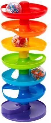 Kulkowa Wieża Zjeżdżalnia z Piłkami Fontanna Tęcza Kulkowa wieża to doskonała zabawka dla rozwijania umiejętności manualnych, wyobraźni przestrzennej i zrozumienia związku przyczynowo-skutkowego. W zestawie znajduje się aż 6 różnokolorowych elementów, z których dziecko może ułożyć wieżę oraz trzy piłeczki, które spadając na niższe poziomy, dodatkowo grzechoczą. Żywe, kontrastujące kolory przyciągają wzrok dziecka oraz zachęcają do zabawy. Zróżnicowane elementy są wykonane specjalnie z myślą o małych rączka dziecka, przez co ćwiczą chwytność jego dłoni. W zestawie znajdują się: - 6 różnokolorowych elementów do zbudowania wieży - 3 grzechoczące piłeczki Sugerowany minimalny wiek (według informacji podanej przez producenta na opakowaniu): 12 miesięcy+ Wymiary zabawki: 16 (szer.) x 16 (gł.) x 40 (wys.) cm Wymiary opakowania: 18 (szer.) x 18 (gł.) x 26 (wys.) cm