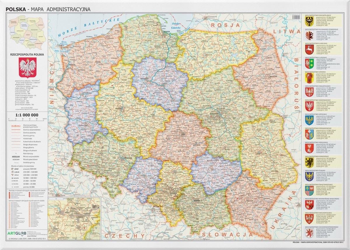 Polska administracyjna - mapa ścienna w skali 1:1 000 000 wydawnictwa ArtGlob to wyjątkowy produkt.Treść topograficzna mapy obejmuje bogatą sieć dróg i autostrad oraz podział administracyjny. Ponadto zamieszczono sieć hydrograficzną i linie kolejowe. Mapę uzupełniają drogowe i kolejowe przejścia graniczne. Zamieszczono również przeprawy promowe i odległości na drogach.Zawartość mapy administracyjnej: granice Państwa, przejścia graniczne, granice województw, granice powiatu, granice gmin, autostrady, autostrady w budowie, drogi ekspresowe, drogi główne, drogi w budowie, porty lotnicze, miasta wojewódzkie, miasta powiatowe, siedziby gmin, gminy o nazwach różniących się od nazw ich siedzib, opis poszczególnych województw, oraz inne przydatne informacje. Przyjazna kolorystyka i czytelna grafika sprawia, że mapa ta idealnie nadaje się do biura, spedycji.Dlaczego warto kupić mapę administracyjną na płótnie? to unikalny, oryginalny obraz Polski administracyjnej, przygotowany przez profesjonalnych kartografów. mapa jest wykonana w najwyższej jakości i estetyce, przy użyciu ekologicznych tonerów i profesjonalnego płótna malarskiego. Dzięki czemu jest trwała i stanowi piękną ozdobę ścian: pokoju, biura, salonu, gabinetu. mapa Polska administracyjna wydawnictwa ArtGlob.pl jest jedną z najładniejszych map dostępnych na rynku. mapa jest profesjonalnie pakowana i bezpiecznie dojedzie na każdy kraniec świata. Szukasz wyjątkowej dekoracji wnętrz, obrazu do biura lub ozdoby ścian? Mapa na płótnie jest oryginalnym elementem do każdego wystroju domu, salonu lub biura. Mapy dostępne w naszym sklepie są wyjątkowej jakości i najwyższej klasy. Mapy wyszły spod pióra doświadczonych kartografów, nagradzanych wielokrotnie na ogólnopolskich konkursach kartograficznych.Tchnij nowe życie we wnętrze zawieszając na ścianie mapy typu canvas z naszej kolekcji!