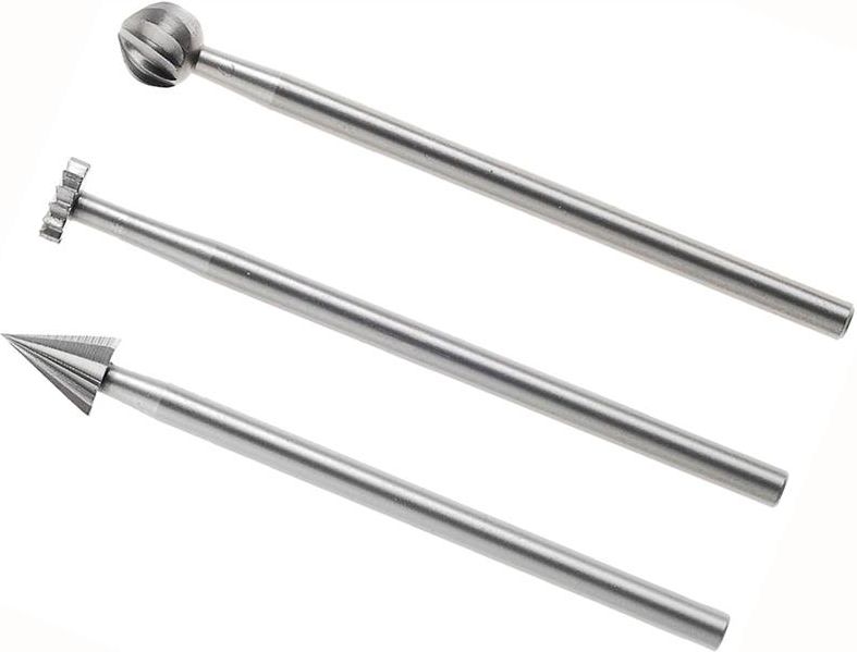 Cechy użytkowe: Frez wykonany z wysokiej jakości stali wolframowo-wanadowej Frez wykonany z odkuwki co gwarantuje stabilną konstrukcję i wysoką koncentryczność Precyzyjne żłobkowania i optymalna koncentryczność zapewniają dużą trwałość. Idealnie nadaja sie do ręcznej precyzyjnej pracy w twardym i miękkim drewnie, metalach szlachetnych i nieżelaznych, tworzywach sztucznych i gipsie Można nim wykonywac takie prace jak frezowanie, żłobienie, struganie poprzeczne i pionowe oraz profilować Średnica trzpienia 2,35 mm W komplecie 3 frezy kształtowe 5 mm: tarcza, kulka i stożek
