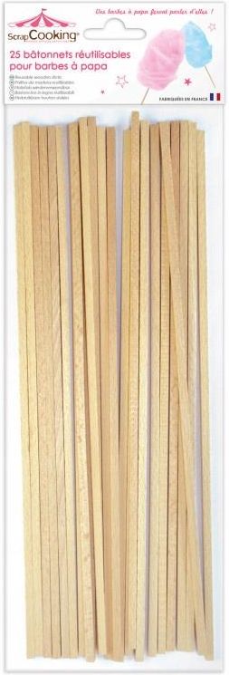 Komplet 25 szt. patyczków do robienia czekoladowych lizaków, waty cukrowej francuskiej firmy ScrapCooking. Patyczki nadają się do użycia w piekarniku. Opakowanie zawiera 25 sztuk patyczków. Długość patyczka: 28 cm Materiał: drewno bukowe odpowiednie do kontaktu z żywnością. SCRAPCOOKING to francuska marka produktów do pieczenia i dekorowania cenionych szczególne przez miłośników pieczenia. Produkty tej marki charakteryzuje niezawodna jakość.