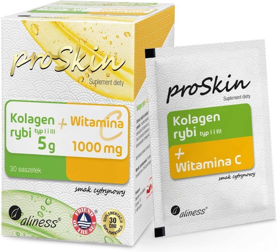Aliness Proskin Kolagen Rybi + Witamina C Cytryna 30 saszetek Wstęp Nutrikosmetyki stanowią nowoczesne wsparcie w codziennej pielęgnacji, oferując skuteczne składniki, które mają na celu poprawę zdrowia i wyglądu skóry. Wśród dostępnych produktów wyróżnia się ten suplement diety, który dzięki wysokiej zawartości kolagenu rybiego oraz witaminy C dostarcza organizmowi cennych substancji wspierających elastyczność i nawilżenie skóry. Regularne spożywanie kolagenu może przyczynić się do niezwykłej poprawy kondycji skóry oraz regeneracji stawów, co czyni go doskonałym wyborem dla osób pragnących zadbać o swoje zdrowie i urodę. Pojemność i forma Aliness Proskin Kolagen Rybi + Witamina C dostępny jest w wygodnych saszetkach, z których każda zawiera 30 porcji. Każda saszetka dostarcza aż 5000 mg hydrolizowanego kolagenu rybiego oraz 1000 mg witaminy C. Produkt można łatwo rozpuścić w zimnej wodzie, co pozwala uzyskać orzeźwiający napój o naturalnym cytrynowym smaku. To doskonała opcja dla osób, które preferują codzienne wspieranie organizmu w wygodny sposób. Skład i składniki aktywne Skład Aliness Proskin Kolagen Rybi + Witamina C jest starannie dobrany, aby maksymalizować korzyści zdrowotne. Kluczowe składniki aktywne to: Hydrolizowany kolagen rybi – 5000 mg, Witamina C (kwas L-askorbinowy) – 1000 mg. Dodatkowo, witamina C wspomaga produkcję kolagenu, co jest kluczowe dla zdrowego funkcjonowania skóry, kości czy naczyń krwionośnych. Dzięki temu ten preparat nie tylko wpływa na wygląd skóry, ale także wspiera regenerację organizmu. Działanie i wskazania Suplement ten wykazuje szereg korzystnych działań, które wpływają na różne aspekty zdrowia i urody. Oto niektóre z nich: Wspiera elastyczność i nawilżenie skóry – Kolagen jest kluczowym budulcem skóry, a jego odpowiednia ilość sprawia, że skóra staje się jędrna i nawilżona. Regeneracja stawów i tkanek łącznych – Pomaga w procesach regeneracyjnych, co jest szczególnie istotne dla osób aktywnych fizycznie lub starszych. Ochrona przed stresem oksydacyjnym – Witamina C chroni komórki przed szkodliwym działaniem wolnych rodników. Dzięki tym właściwościom, suplement ten może być idealnym rozwiązaniem dla osób pragnących zadbać o zdrowie swojej skóry oraz wspierać stawy i tkankę łączną. Dawkowanie Zalecane dawkowanie to jedna saszetka dziennie. Aby uzyskać najlepsze rezultaty, warto spożywać preparat regularnie, rozpuszczając zawartość saszetki w szklance zimnej wody. Dzięki temu codzienna porcja kolagenu i witaminy C staje się przyjemnością, a nie obowiązkiem. Przeciwwskazania i bezpieczeństwo Przed rozpoczęciem suplementacji warto zapoznać się z ewentualnymi przeciwwskazaniami. Suplement nie jest zalecany w przypadku nadwrażliwości na którykolwiek ze składników, a także dla osób z alergiami pokarmowymi. Osoby w ciąży lub karmiące piersią powinny skonsultować się z lekarzem przed rozpoczęciem stosowania. Dodatkowe cechy Aliness Proskin Kolagen Rybi + Witamina C wyróżnia się także dodatkowymi cechami: Hipoalergiczność – Produkt jest bezpieczny dla osób z wrażliwą skórą, Brak parabenów i sulfatów – Suplement nie zawiera szkodliwych substancji chemicznych, Ekologiczne pochodzenie – Kolagen rybi pozyskiwany jest w zrównoważony sposób, z poszanowaniem dla środowiska morskiego, co potwierdza certyfikat FOS® (Friend of the Sea). Dzięki tym cechom, produkt stanowi doskonały wybór dla osób poszukujących naturalnych i skutecznych rozwiązań w dbaniu o zdrowie i urodę.