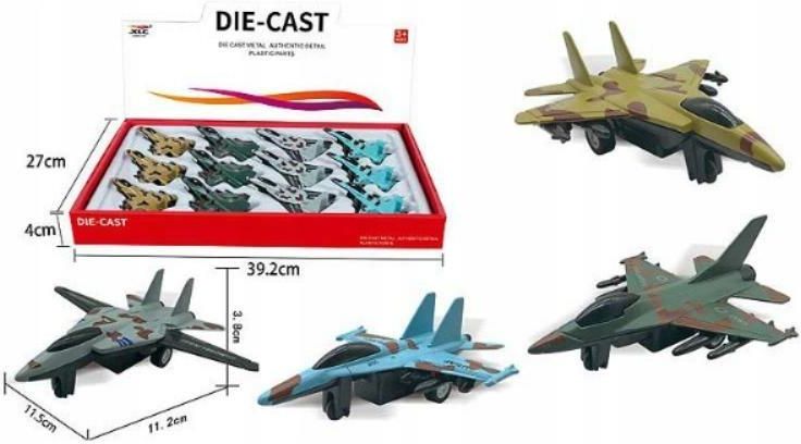 SUPER SAMOLOT DLA FANA LOTNISK I PODRÓŻY ! Wojskowy myśliwiec Wykonany z metalu, posiada plastikowe elementy wyposażenia i ruchome kółka, dzięki czemu porusza się po powierzchniach płaskich. Zabawka została zrobiona bardzo precyzyjnie i wiernie odzwierciedla prawdziwy pojazd. Trwały materiał, odporny na częstą zabawęŚwietne, nowoczesne kolory każdego z pojazdówWiek 3+Certyfikat CE Wymiary: 1 szt - 11,5 cm4 kolory, wysyłamy losowo