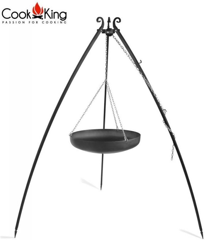 Kolor: czarny Wymiary: Wysokość trójnogu: ok. 180 cm Średnica woka: 60 cm Materiał z jakiej wykonano wok: stal czarna Waga produktu: ok. 12 kg Trójnóg malowany proszkowo: TAK Trójnóg składany w połowie: TAK Materiał: stal, żeliwo Zamiar woka jest taki by wisiał na trójnogu bezpośrednio nad …