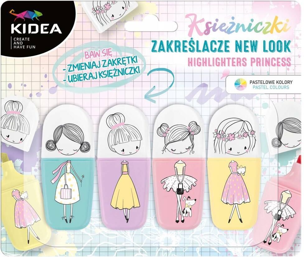Mini Zakreślacze pastelowe New Look Księżniczki 4 kolory Kidea ZKNLKA Zakreślacze pastelowe w czterech kolorach: różowym, żółtym, fioletowym oraz turkusowym. Na każdym z zakreślaczy znajduje się stylowa księżniczka. Zmieniąjąc zakrętki z główkami księżniczek można bawić się i przebierać je w różne stylizacje znajdujące się na zakreślaczach, jednocześnie nadając im zupełnie nowy look. Mini zakreślacze zmieszczą się w każdym piórniku, a notatki wykonane z ich pomocą będą wyglądały przejrzyście i estetycznie, tym samym pomagając w szybszym przyswojeniu wiedzy.
