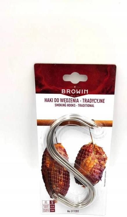 Haki do wędzarni kształt „S” - 5 szt. Wygodne wędzenie - dzięki tradycyjnym hakom do wędzenia w wygodny sposób uwędzisz swoje wyroby mięsne stabilnie montując je na drążkach. Dzięki swobodnemu dostępowi dymu do całej powierzchni mięsiwa masz gwarancję równomiernego uwędzenia swoich wyrobów.​​Pomoc w przechowywaniu mięs - uniwersalna konstrukcja haków pozwala na ich użytkowanie również poza wędzarnią. Pozostaw swoje szynki lub kiełbasy na hakach w spiżarni bez obaw, że ulegną uszkodzeniu lub niechcianemu pożarciu przez zwierzaki.Idealne do produkcji wędlin dojrzewających - uniwersalna konstrukcja nadaje się nie tylko do wędzenia ale także do przygotowywania dojrzewających wędlin.Solidne wykonanie - haki wykonane są z wysokiej jakości stali nierdzewnej dzięki czemu przez dług czas zachowują wysoką przydatność. Stal ta jest odporna na wysokie temperatury, odkształcanie i rdzewienie. Haki przeznaczone są do kontaktu z żywnością. 5908277700065 011010