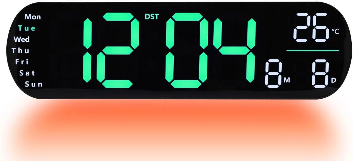 Zegar ścienny z pilotem, budzik sieciowy z zielonymi cyframi LED, termometrem, stoperem, timerem. Długość 35 cm. Cyfry 7,5 cm. Alarm / budzik. Duży budzik zegar stołowy szafkowy do biura pokoju salonu. Dni tygodnia w języku angielskim