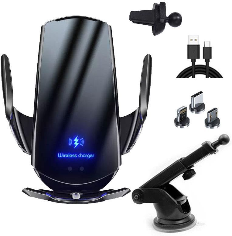 Bezprzewodowa Ładowarka Samochodowa Indukcyjna QI Automatyczna Q3 Zestaw z regulowanym ramieniem teleskopowym z przyssawką na szybę lub deskę rozdzielczą + mocowanie na kratkę nawiewu Bardzo solidny uchwyt na kratkę nawiewu lub na szybę z możliwością bezprzewodowego ładowania telefonu. Ładowanie telefonu nigdy nie było łatwiejsze. W razie potrzeby podczas podróży naładujesz swój smartphone, dzięki wbudowanej ładowarce indukcyjnej QI lub dodatkowo uchwyt może ładować telefony nie wyposażone w funkcję ładowania indukcyjnego dzięki dołączonym do zestawu końcówkom magnetycznym.Uchwyt posada czujnik, dzięki któremu odkładając telefon do ładowania, ramiona same się rozszerzą i zaciskają telefon.Kolor: Czarny Wygodne i proste w obsłudze Uchwyt posiada specjalny zaczep do kratki nawiewu lub przyssawkę na szybę. Ponadto przegub kulkowy pozwoli Ci dostosować uchwyt do własnych potrzeb.Umieszczanie telefonu jest bardzo proste, dzięki czujnikowi, który przy zbliżeniu telefonu sam rozsuwa ramiona i zaciska.Montaż uchwytu jest bardzo prosty - wystarczy podłączyć dołączony w zestawie przewód USB typu C do gniazda USB w Twoim aucie, następnie podłączyć go do uchwytu. Gdy to zrobisz pozostaje już tylko umieszczenie uchwytu w dowolnym wybranym przez Ciebie miejscu. Kompatybilne Nawet z telefonami bez ładowania indukcyjnego Uchwyt może ładować również telefony nie wyposażone w funkcję ładowania indukcyjnego dzięki dołączonym do zestawu końcówkom magnetycznym wkładanym do gniazda telefonu, które po włożeniu telefonu do uchwytu łączą się z gniazdem magnetycznym. USB typu C Apple Lightning micro USB Pasuje do większości telefonów Uchwyt posiada bardzo solidne, gumowe uchwyty do przytrzymywania telefonu, które się gwarantuje pewne trzymania każdego urządzenia o przekątnej ekranu od 4" do 7" w dowolnym etui. Czujniki zbliżeniowy i przycisk dotykowy Czujnik zbliżeniowy z przodu urządzenia umożliwia otwarcie ramion uchwytu po przybliżeniu do niego telefonu. Przycisk dotykowy umieszony na górze z tyłu urządzeniu umożliwia otwarcie ramion uchwytu i wyjęcie telefonu. Kompatybilne z poziomymi kratkami wentylacyjnymi Parametry i cechy produktu montaż w kratce nawiewu lub na szybie za pomocą przyssawki, regulacja kąta nachylenia, obrót o 360 stopni, kolor: czarny, rodzaj trzymania: zaciskowe automatyczne, automatyczne zamykanie i otwieranie rodzaj ładowania: bezprzewodowe (indukcyjne QI), 3 końcówki do ładowania magnetycznego (Lightning - Apple, MicroUSB, USB-C) moc wejściowa: 5V/2A, 9V/1.67A, moc wyjściowa: 15W, 10W, 7,5W, 5W materiał: ABS Mechaniczne, ciche automatyczne ramion Uniwersalne mocowanie na kratkę nawiewu z funkcją obrotu 360 stopni Czujnik zbliżeniowy automatycznie otwiera uchwyt Przycisk dotykowy z góry (z tyłu), aby zwolnić uchwyt Wymiary: Długość: 12,3 cm Szerokość: 7,3 cm Wysokość: 1,7 cm Ramiona rozłożone: 10 cm Ramiona złożone: 6 cm Zawartość zestawu: bezprzewodowa automatyczna ładowarka indukcyjna QI - Czarny, kabel USB - USB Typu C, pudełko, mocowanie do kratki nawiewu. Przyssawka na szybę 3 zamienne końcówki do ładowania indukcyjnego: USB typu C, microUSB, Apple Lightning
