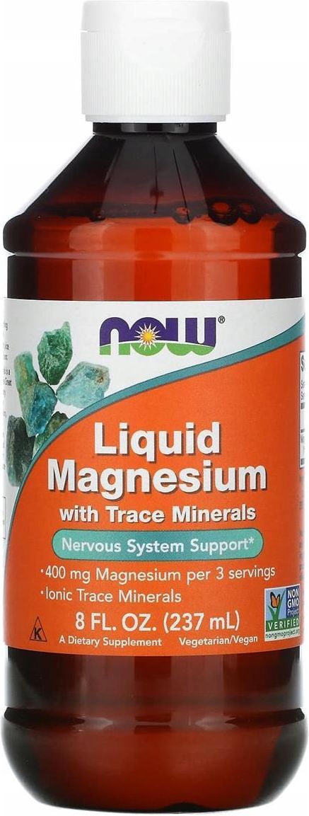 ✓ GWARANCJA NAJWYŻSZEJ JAKOŚĆI, NOW FOODS MARKA NUMER JEDEN W USA ✓ SUPLEMENT W PŁYNIE ZAWIERA WYSOKIE ILOŚCI MAGNEZU W PORCJI ✓ BARDZO DOBRZE PRZYSWAJALNA FORMA MAGNEZU ✓ REGULUJE PRACE SERCA ✓ ZDECYDOWANIE WZMACNIA KOŚCI ✓ ZAPOBIEGA SKUROCZOM ✓ POLEPSZA SAMOPOCZUCIE NOW Liquid Magnesium with Trace Minerals NOW Liquid Magnesium with Trace Minerals to naturalny koncentrat mineralny pozyskiwany z Wielkiego Jeziora Słonego i produkowany przy użyciu opatentowanego procesu odparowywania słonecznego. Proces ten usuwa również 99% naturalnie występującego sodu, przy jednoczesnym zachowaniu jego pozostałych 72 naturalnie występujących minerałów śladowych w ich biodostępnych formach jonowych. Obecność magnezu i innych pierwiastków śladowych w organizmie jest niezbędna dla prawidłowych reakcji biochemicznych, utrzymania zdrowej równowagi elektrolitowej i zdrowej funkcji nerwowo-mięśniowej. Magnez jest minerałem, który ma kluczowe znaczenie dla produkcji energii i metabolizmu, skurczu mięśni, przekazywania impulsów nerwowych i mineralizacji kości. Jest to wymagany kofaktor dla około 300 enzymów. Wśród reakcji katalizowanych tymi enzymami jest synteza kwasów tłuszczowych, białko synteza i metabolizm glukozy. Ponadto magnez wspomaga przyswajanie wapnia przez tkankę kostną oraz poprawia wchłanianie jelitowe potasu. Magnez stabilizuje poziom fosforanów wapnia, co zapobiega ich demineralizacji, stymuluje mechanizmy obronne organizmu, przenosi rodniki acetylowe i hydroksylowe, niezbędne w początkowej fazie procesu steroidogenezy (w wyniku którego powstaje m.in. testosteron i DHEA), oraz rodniki fosforanowe sterujące syntezą hormonu wzrostu, insuliny i insulino-podobnego czynnika wzrostu (IGF). Wspiera układ nerwowy i zapewnia ukojenie, przeciwdziałając stresowi. Magnez pozytywnie oddziałuje na pracę mózgu, wspomaga procesy zapamiętywania, optymalizuje skupienie, a tym samym Twoje wyniki w pracy i w nauce. Wspomaga prawidłowe działanie układu krążenia i zapobiega nadciśnieniu.