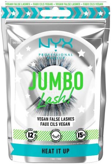 JUMBO Lash! Vegan False Lashes marki NYX Professional Makeup. Sztuczne rzęsy. Są w całości wegańskie, i przy ich produkcji nie ucierpiało żadne zwierzę. Pochodzą z serii JUMBO, w skład której wchodzi specjalny eyeliner i klej w jednym, i to dla niego docelowo zostały stworzone. Są bardzo lekkie dzięki czemu wcale nie czuć i na powiece przez cały czas noszenia. Przezroczysty pasek zapewnia naturalne stapianie się z naturalną linią rzęs. Podczas stosowania w parze z liner'em z tej samej serii utrzymują się nawet do 12 godzin, a także mogą być wykorzystywane do 15 razy. Dostępne są w kilku modelach. Sztuczne rzęsy.Są w 100% wegańskie. Są lekkie i nie obciążają powieki. Przeznaczone do używania z liner'em z tej samej serii.