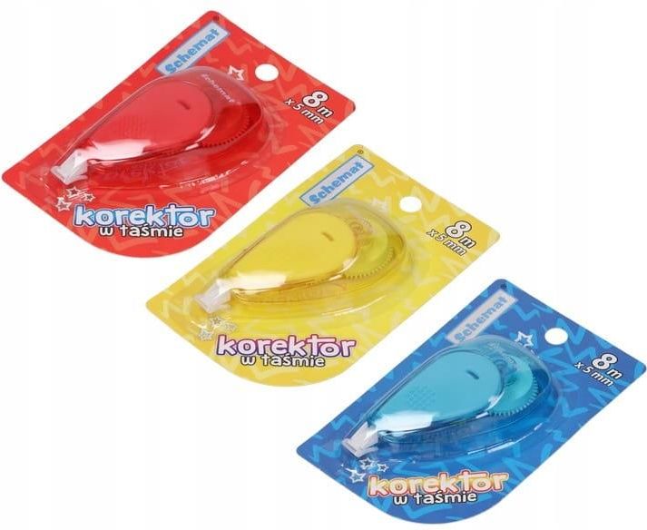 Korektor w taśmie 8m x5mm Schemat 1508 KOREKTOR W TAŚMIE MYSZKA 8m x 5mm Korektor w taśmie wygodny w użyciu dzięki ergonomicznej obudowie dostosowanej do dłoni, Przeznaczony do korekcji tekstu, po korekcji możliwość natychmiastowego pisania. Dane - transparentny kolor umożliwia śledzenie zużycia taśmy - wysokiej jakości taśma korekcyjna odporna na zerwanie z idealnie przylegająca do powierzchni papieru warstwa korektora, po której można pisać bezpośrednio po zastosowaniu do stosowania na wszystkich typach papieru nie pozostawia śladów i cieni na kserokopiach i faksach do użytku w domu, szkole oraz biurze przyjazny dla środowiska, nietoksyczny, nie zawiera rozpuszczalników długość taśmy: 8m szerokość taśmy: 5mm KOLOR MIX