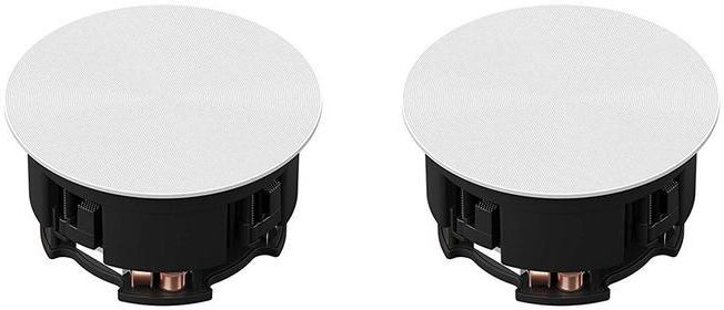 Głośniki sufitowe (para) Zaprojektowane i dostrojone przez Sonos. Specjalnie wykonane przez Sonance. Te głośniki oferują naturalny, wypełniający pomieszczenie dźwięk i doskonale komponują się z wystrojem. Sprzedawane w zestawie dwóch sztuk. Głośniki pasywne muszą być zasilane za pomocą wzmacniacza (sprzedawany osobno). przetworniki: 6,5" głośnik niskotonowy, 1" głośnik wysokotonowy pasmo przenoszenia (bez DSP): 44 Hz - 20 kHz (±3 dB) czułość: 89 dB (2,83 V / 1 m) impedancja: 8 Ω moc znamionowa: 130 W zoptymalizowany do użytku z Sonos Amp, który odblokowuje Trueplay system szybkiego montażu Roto-Lock okrągła, magnetyczna maskownica z możliwością malowania (dostępna opcja kwadratowa) waga (z maskownicą i uchwytem): 2,3 kg (każdy) głębokość montażu: 120,3 mm średnica (z maskownicą): 235,5 mm średnica wycięcia: 209,6 mm waga netto: 4,60 kg