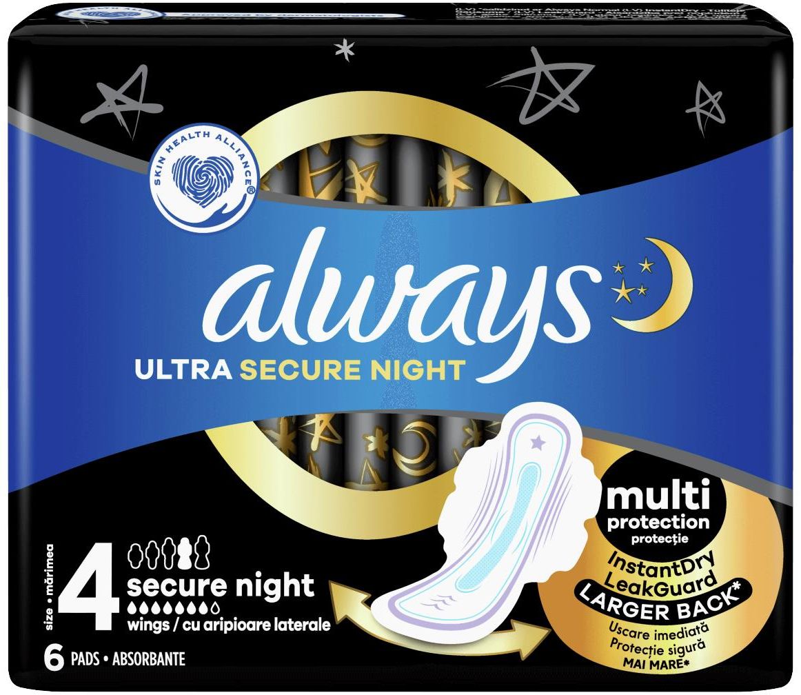 ALWAYS ULTRA SECURE NIGHT 6 Podpaski Always Ultra Night (rozmiar 4) z systemem InstantDry wchłaniają wilgoć w kilka sekund. Zamykają płyn w swoim wnętrzu, zapewniając nawet 100% ochrony. Podpaski Always Ultra wyposażone są w technologię neutralizującą niechciany zapach, który jest blokowany, a nie …