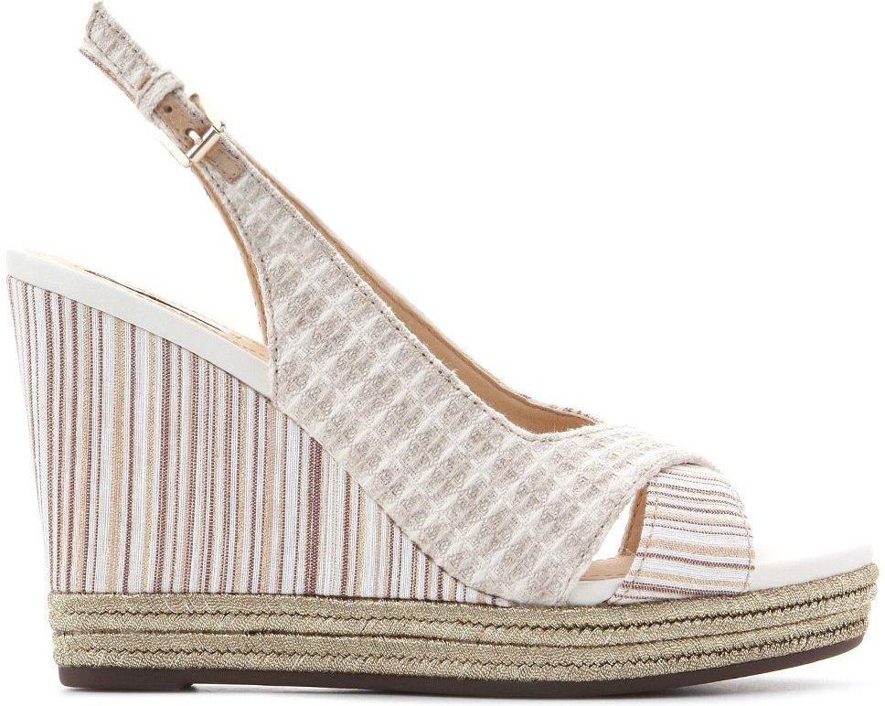 Atrakcyjne damskie obuwie na koturnie 10 cm na cieplejszą porę roku. Właściwości Tekstylna cholewka wykonana została z dwóch materiałów o różnej strukturze. Dodatkową ozdobę stanowi złota klamerka dająca jednocześnie możliwość regulacji paska na pięcie oraz wykończenie wokół podeszwy na wzór podwójnego złotego warkocza. Perforowana podeszwa w brązowym kolorze współgra z całością. Technologia Geox Respira - opatentowana perforowana podeszwa buta, zbudowana na bazie membrany z mikroporami, która pochłania i wydala pot, nie przepuszczając przy tym wody do wnętrza buta.