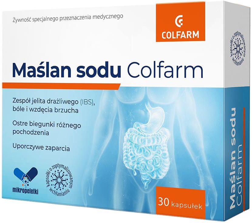 Żywność specjalnego przeznaczenia medycznego Colfarm, Maślan sodu, 30 kapsułek Maślan sodu Colfarm to żywność specjalnego przeznaczenia medycznego dla dorosłych. Zawiera maślan sodu w postaci mikropeletek o przedłużonym uwalnianiu, zamkniętych w celulozowych kapsułkach odpornych na działanie kwasów …
