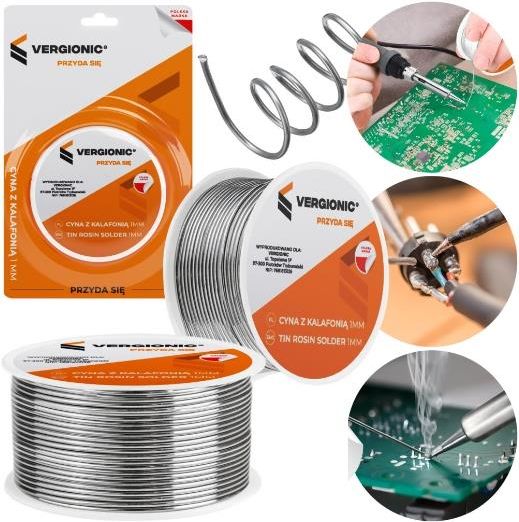 CYNA Z KALAFONIA DO LUTOWANIA 1 mm 100 g Towar zapakowane fabrycznie przez producenta. W skład zestawu wchodzi CYNA Z KALAFONIA DO LUTOWANIA 1 mm 100 g Specyfikacja Grubość: 1 mm Waga: 100 g Temperatura topnienia: 220-250ºC Cyna z kalafonią do lutowania 1 mm 100 g Cyna z kalafonią to bardzo prosta oraz wydajna substancja służąca do lutowania. Swoje zastosowanie znajdzie w domu, warsztacie czy pracowni. Doskonale sprawdzi się do lutowania podczas produkcji urządzeń i podzespołów elektronicznych, elektrotechnice oraz do lutowania elementów z pokryciem cynowym, cynowo ołowiowym, kadmowym, cynkowym oraz srebrnym. Dodatkowo często używana jest w motoryzacji jak i przemyśle chłodniczym. Pozostałości cyny nie powodują korozji, dlatego nie trzeba ich usuwać. Charakteryzuje się bardzo prostym użyciem dzięki nawinięciu jej na szpulkę. Informacje o produkcie Cyna z kalafonią do lutowania 1 mm VERGIONIC Cyna z kalafonią to bardzo prosta oraz wydajna substancja służąca do lutowania. Swoje zastosowanie znajdzie w domu, warsztacie czy pracowni. Doskonale sprawdzi się do lutowania podczas produkcji urządzeń i podzespołów elektronicznych, elektrotechnice oraz do lutowania elementów z pokryciem cynowym, cynowo ołowiowym, kadmowym, cynkowym oraz srebrnym. Dodatkowo często używana jest w motoryzacji jak i przemyśle chłodniczym. Pozostałości cyny nie powodują korozji, dlatego nie trzeba ich usuwać. Charakteryzuje się bardzo prostym użyciem dzięki nawinięciu jej na szpulkę.