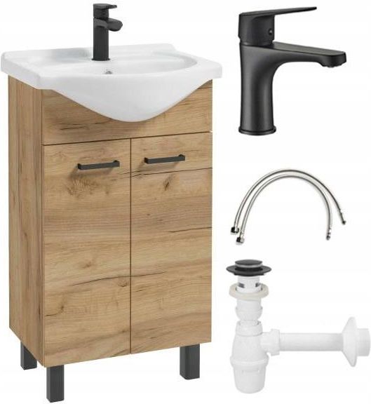 Zestaw łazienkowy dąb craft 50 z baterią umywalkową czarną ✔️Doskonały do małej łazienki zestaw Mea składający się z szafki z umywalką 50 cm to funkcjonalny mebel, który optycznie powiększy pomieszczenie i dzięki któremu stworzysz dodatkową przestrzeń. Zestaw Mea szafka z umywalka to świetny wybór, jeśli szukasz czegoś w nowoczesnym stylu, który pasuje do większości płytek i armatury. Najważniejsze cechy szafki łazienkowej z umywalką to: ✨wykonana z płyty laminowanej ✨do samodzielnego montażu w zestawie z niezbędnymi akcesoriami, ✨w nowoczesnym, kompaktowym stylu, ✨wygospodarowuje miejsce do przechowywania. ✨Umywalka z ceramiki jest łatwa w utrzymaniu czystości i odporna na działanie chemikaliów. W skład zestawu wchodzą: ◉ umywalka 50 ◉ szafka pod umywalkę ◉ korek klik-klak czarny ◉ półsyfon umywalkowy 50mm ◉ bateria jednouchwytowa (długość wylewki około 12 cm) ◉ wężyki do baterii 3/8 cala, 34 cm, z uszczelkami Zalety: ⚡Oszczędność miejsca: Szafka o szerokości 50 cm doskonale nadaje się do mniejszych łazienek lub pomieszczeń, gdzie nie ma zbyt wiele miejsca na tradycyjną umywalkę i oddzielną szafkę. ⚡Funkcjonalność: Pomimo swojego kompaktowego rozmiaru, szafka z umywalką oferują praktyczne rozwiązania, które pozwalają na przechowywanie artykułów toaletowych i innych akcesoriów łazienkowych. ⚡Łatwość montażu: Ze względu na niewielkie rozmiary, szafka z umywalką 50 cm może być stosunkowo łatwa do zainstalowania nawet w małych przestrzeniach. ⚡Ergonomia: Szafka o tej szerokości może być dobrze dostosowana do użytku przez różne osoby, niezależnie od wzrostu czy gabarytów. Parametry: Zastosowanie: Meble łazienkowe Kolor dominujący: Dąb craft Kolor Frontu: Dąb craft Kolor Korpusu: Dąb craft Szerokość całkowita: 50,5 cm Szerokość umywalki: 50,5 cm Wysokość szafki z umywalką: 85 cm Szerokość szafki: 46 cm Głębokość szafki: 28 cm Głębokość umywalki: 41,5 cm Wysokość nóżek: 7 cm Głębokość komory umywalki: 11 cm Klamki, uchwyty: Uchwyt dwupunktowy Sposób montażu: Do samodzielnego montażu Wykonanie umywalki: Ceramika Lakierowane: Nie Wykonanie korpusu: Płyta laminowana Wykonanie frontu: Płyta laminowana Nóżki: Tak Waga: 20 kg