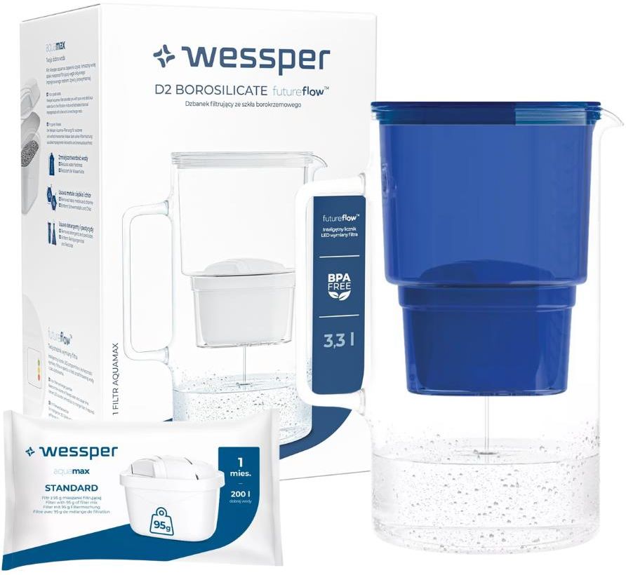 Szklany dzbanek filtrujący D2 BOROSILICATE marki Wessper o pojemności 3,3 l z filtrem Aquamax to doskonała propozycja dla osób ceniących ekologiczne rozwiązania w swoim domu. Dzbanek wykonany jest ze szkła borokrzemowego, które charakteryzuje się wysoką wytrzymałością i odpornością na zmiany temperatury.[vc_row][vc_column width="1/2"][vc_column_text woodmart_inline="no" text_larger="no"] Szklany dzbanek filtrujący Wessper D2 BOROSILICATE Niebieski Szklany dzbanek filtrujący D2 BOROSILICATE marki Wessper o pojemności 3,3 l z filtrem Aquamax to doskonała propozycja dla osób ceniących ekologiczne rozwiązania w swoim domu. Dzbanek wykonany jest ze szkła borokrzemowego, które charakteryzuje się wysoką wytrzymałością i odpornością na zmiany temperatury. Jest wolny od szkodliwego dla zdrowia BPA (Bisfenolu A), a także posiada Atest PZH wydany przez Narodowy Instytut Zdrowia Publicznego.Zestaw zawiera: Szklany dzbanek filtrujący Wessper D2 BOROSILICATE 1 x wkład filtrujący Wessper Aquamax Zalety dzbanka filtrującego D2 Borosilicate: Elegancki i nowoczesny wygląd Produkt atestowany (Atest PZH) Wykonany z wytrzymałego szkła borokrzemowego Komponenty użyte do produkcji dzbanka są wolne od Bisfenolu A (BPA) [/vc_column_text][/vc_column][vc_column width="1/2"][vc_single_image image="35469" img_size="full" parallax_scroll="no" woodmart_inline="no"][/vc_column][/vc_row][vc_row][vc_column width="1/2"][vc_single_image image="34451" img_size="full" parallax_scroll="no" woodmart_inline="no"][/vc_column][vc_column width="1/2"][vc_column_text woodmart_inline="no" text_larger="no"]Wkład filtrujący Wessper Aquamax składa się z mieszanki filtrującej z węgla aktywnego impregnowanego srebrem i żywicy jonowymiennej. Wkład zapewnia poprawę smaku i zapachu wody wodociągowej.Zalety wkładu filtrującego Wessper Aquamax: Redukuje twardość wody. Usuwa chlor i metale ciężkie. Usuwa detergenty i pestycydy. Poprawia smak i zapach wody. Zalecenia odnośnie użytkowania: Filtr powinien być stale zanurzony w wodzie. Należy wymieniać filtr co miesiąc lub po przefiltrowaniu ok. 200 l wody (w zależności od jej twardości). Należy filtrować wyłącznie zimną wodę kranową. Najlepiej zużyć wodę do 24 godzin od jej przefiltrowania. Nie wystawiać przefiltrowanej wody na działanie promieni słonecznych. [/vc_column_text][/vc_column][/vc_row][vc_row][vc_column width="1/2"][vc_column_text woodmart_inline="no" text_larger="no"] Szczegółowe informacje: Model: D2 Borosilicate Pojemność: 3,3l Kolor: przezroczysty, niebieski Typ filtra: Aquamax Standard Wydajność filtra: miesiąc lub do 200 l wody (zużycie filtra zależne jest od jakości wody) Wysokość: 25 cm Średnica: 14,5 cm Dodatkowe informacje: Dzbanek można myć w zmywarce. Pozostałe elementy: wkładkę filtracyjną z tworzywa sztucznego, pokrywę oraz uszczelkę należy myć ręcznie. Przed pierwszym użyciem dzbanka filtrującego, należy pamiętać o umyciu jego elementów składowych. W tym celu należy użyć ciepłej wody i płynu do mycia naczyń. Pierwsza przefiltrowana woda może być mętna. Można jej użyć do podlania roślin. Jeżeli woda nie przepływa przez filtr, należy go wyjąć, wstrząsnąć nim i ponownie zainstalować. [/vc_column_text][/vc_column][vc_column width="1/2"][vc_single_image image="35470" img_size="full" parallax_scroll="no" woodmart_inline="no"][/vc_column][/vc_row]