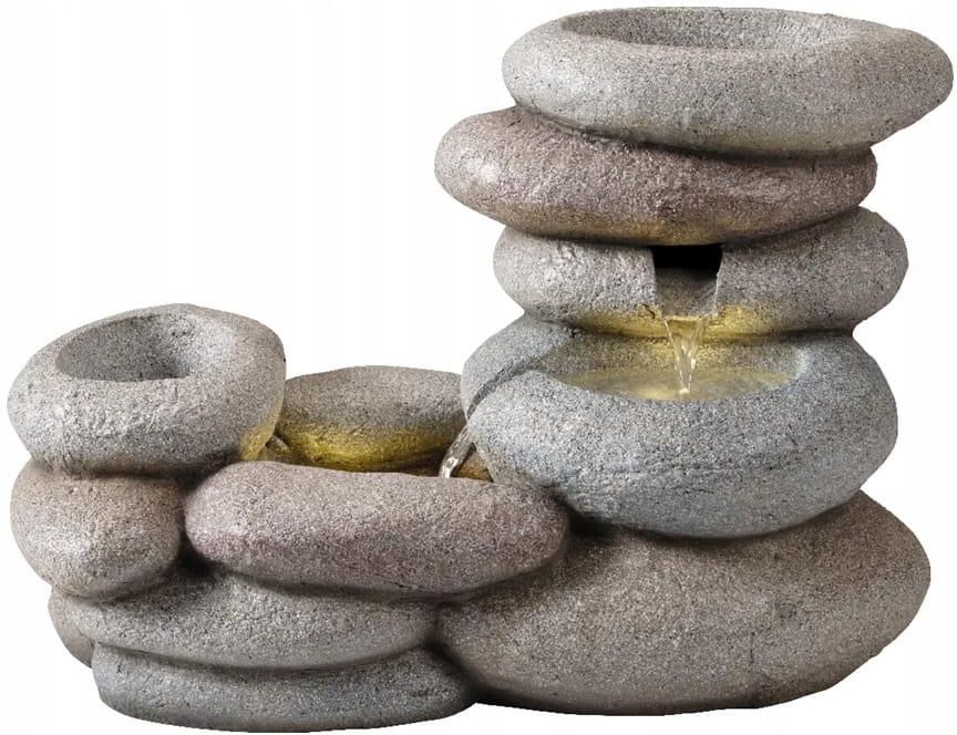 Fontanna ogrodowa LED z polyresinu szara 57,5cm z podświetleniem i pompą Ciesz się relaksującym szumem wody i ciepłym blaskiem światła dzięki tej wyjątkowej fontannie ogrodowej. Wykonana z trwałego materiału polyresin, prezentuje naturalny wygląd i wysoką odporność na warunki atmosferyczne. Wbudowane oświetlenie LED w ciepłej bieli podkreśla piękno wody płynącej z trzech podświetlanych punktów, tworząc magiczną atmosferę po zmroku. Idealna jako dekoracja do ogrodu, na taras lub balkon. Dzięki zasilaniu transformatorowemu i długiemu 10-metrowemu kablowi, instalacja jest łatwa i wygodna. Zalety Naturalny, kamienny wygląd dzięki wysokiej jakości polyresin Przeznaczona do użytku zewnętrznego – odporna na warunki pogodowe Relaksujący efekt wodny z podświetleniem LED w ciepłym odcieniu Łatwy montaż dzięki 10-metrowemu kablowi Energooszczędna technologia LED Gotowa do użycia – zawiera pompę i transformator Parametry Kolor: Szary Materiał: Polyresin (żywica syntetyczna) Wykończenie: Tłoczone Źródło światła: LED Barwa światła: Ciepła biel Liczba lamp: 3 Rodzaj: Ozdoba wodna, fontanna stojąca Zasilanie: Kabel Długość kabla: 10 metrów Z adapterem Klasa szczelności: IP-44 (do użytku zewnętrznego) Brak funkcji sterowania aplikacją, pilota, timera, ściemniania i migania Długość: 30 cm Szerokość: 57,5 cm Wysokość: 41 cm