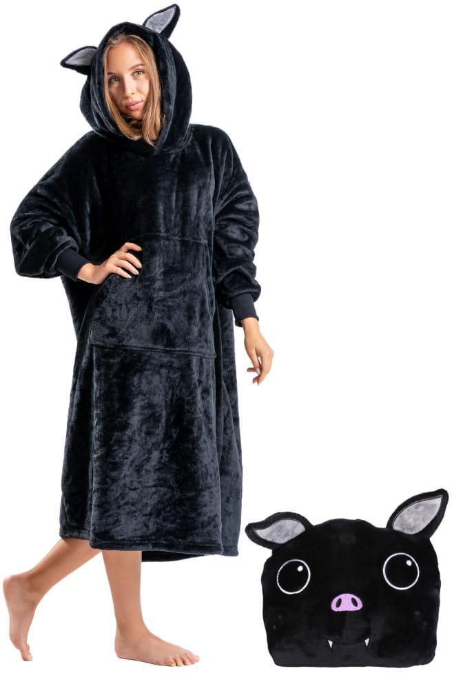 Kocobluza Moraj będąca swoistym 2 w 1 czyli połączeniem oversize ciepłej koszuli nocnej oraz poduszki w kolorze czarnym. Kocobluza posiada kaptur na którym znajdują się uszy oraz aplikacje przypominające nietoperza. Rękaw długi zakończony ściągaczem, na brzuchu praktyczna kieszeń typu kangurka. Długość za kolano. W kapturze znajduje się ukryty suwak co pozwala przekształcić w szybki i prosty sposób w poduszkę. Rozmiar uniwersalny. Skład: 100% poliester