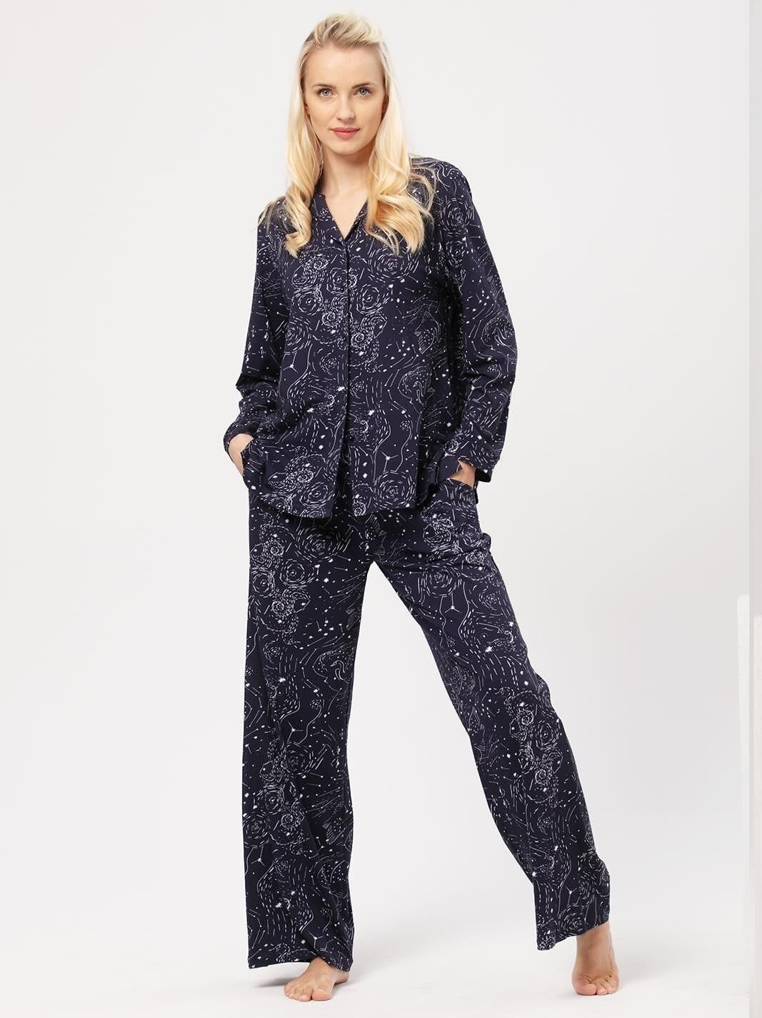 Komplet LHS 911 B24 Kolor: ecru | Rozmiar: S Key Klasyczna piżama damska wykonana z wysokiej jakości bawełny to idealny wybór dla miłośniczek komfortu i stylu. Wzór w konstelacje dodaje jej niepowtarzalnego charakteru, a bluza z długim rękawem z kołnierzykiem, zapinana na guziki, zapewnia elegancki …