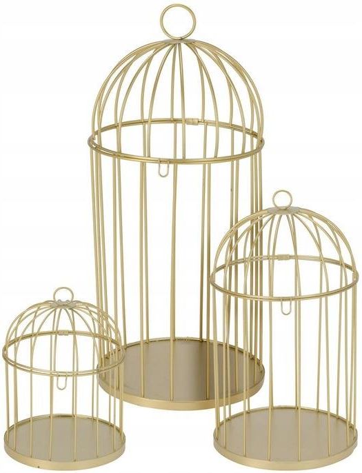 Zestaw 3 ozdobnych klatek złote metalowe różne wielkości Wprowadź do swojego wnętrza odrobinę luksusu dzięki zestawowi trzech dekoracyjnych klatek w kolorze złotym. Wykonane z solidnego metalu o połyskującym wykończeniu, stanowią wyjątkowy akcent aranżacyjny w stylu rustykalnym, glamour lub nowoczesnym. Doskonale sprawdzą się jako samodzielna ozdoba lub efektowna oprawa dla roślin, świec i lampek LED. Zróżnicowane rozmiary klatek pozwalają na tworzenie harmonijnych kompozycji dekoracyjnych – możesz ustawić je razem lub rozdzielić, ozdabiając różne przestrzenie w domu, biurze lub ogrodzie zimowym. Zalety Komplet 3 klatek dekoracyjnych – idealne do tworzenia spójnych aranżacji. Solidne wykonanie z metalu – trwałość i elegancki wygląd przez wiele sezonów. Złoty połysk – nadaje wnętrzu stylu, ciepła i subtelnego luksusu. Lekka, a jednocześnie stabilna konstrukcja – łatwe do przenoszenia i ustawienia. Gotowe do użycia – produkt nie wymaga montażu. Uniwersalne zastosowanie – idealne do salonu, biura, oranżerii, a także na taras. Parametry techniczne Materiał: metal Kolor: złoty (połysk) Wymiary: duża: szerokość: 18,5 wysokość: 41,5 cm średnia: szerokość: 16 wysokość: 29 cm mała: szerokość: 13,5 wysokość: 19 cm Styl: rustykalny / klasyczny / glamour Przeznaczenie: do wnętrz