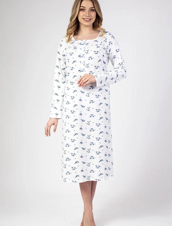 Koszula nocna damska wykonana z wysokogatunkowej bawełny o klasycznym kroju. Koszula z długim rękawem, wzorzysta z motywem kwiatowym, dekolt rozpinany na guziki, długość koszuli za kolano. Skład: 100% bawełna