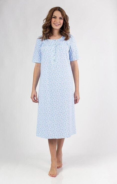 Koszula nocna Regina z krótkim rękawem. Koszula wzorowana , dekolt półokrągły rozpinany na 3 guziki, koszula lekko rozszerzająca się ku dołowi. Długość za kolano. Skład: 100% bawełna