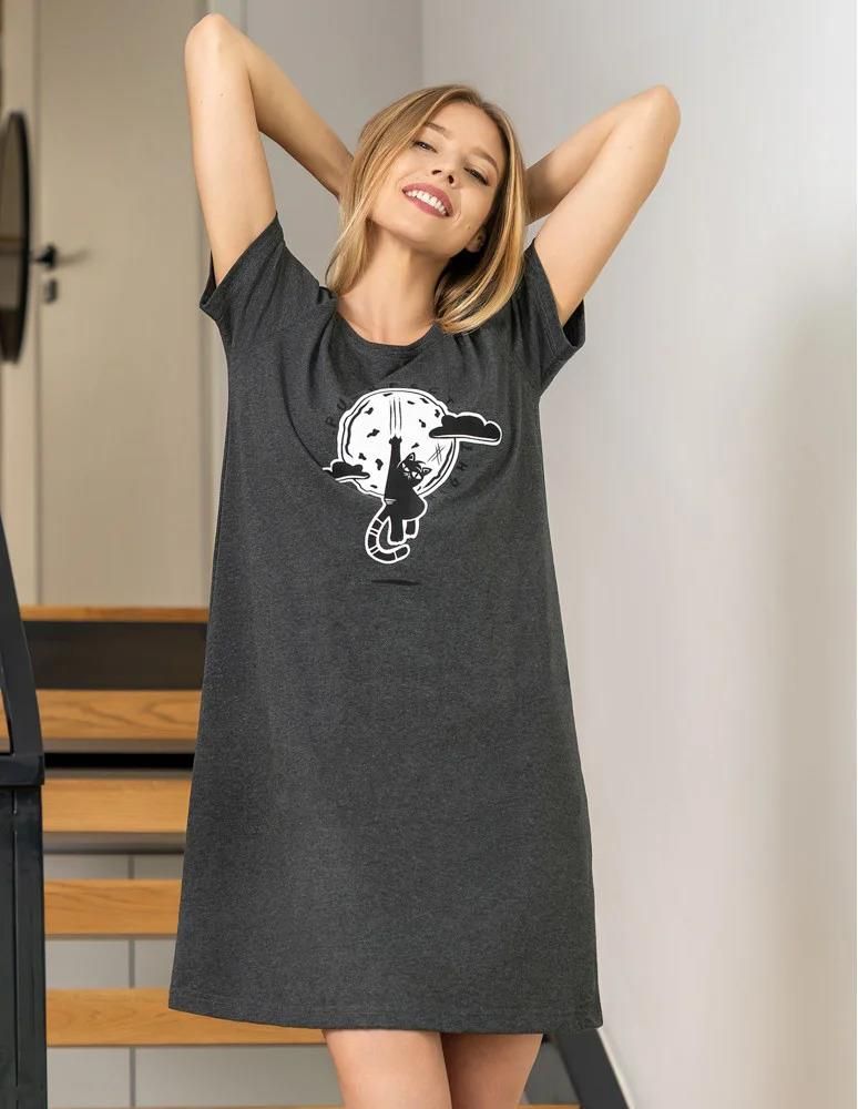 Klasyczna prosta koszula nocna damska Moraj z krótkim rękawem. Koszula jednolita w kolorze grafitowego melanżu, na piersi nadruk z kotem, dekolt półokrągły, długość przed kolano. Skład: 5% elastan, 30% poliester, 65% bawełna