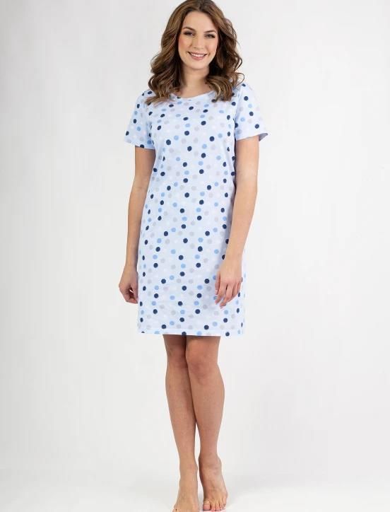 Koszula nocna Regina w klasycznym prostym kroju. Koszula z krótkim rękawem, dekolt półokrągły, długość przed kolano. Całość w kolorze niebieskim wzorowana w kolorowe kropki. Skład: 100% bawełna