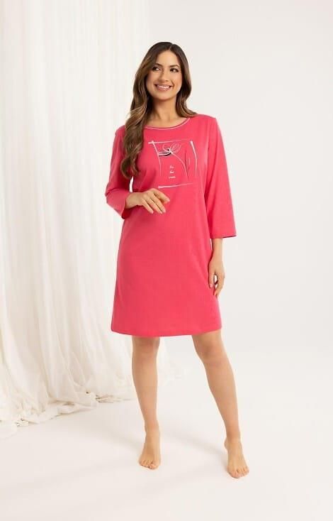 Klasyczna koszula nocna damska Regina o ponadczasowym kroju. Koszula jednolita w kolorze malinowym, na piersi niewielki nadruk, dekolt półokrągły ozdobiony białą lamówką. Długość przed kolano, rękaw 3/4. Skład: 100% bawełna