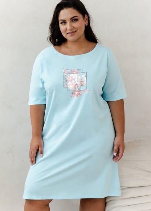 Koszula nocna z krótkim rękawem, wykonana z bawełny. Przód ozdobiony pięknym połyskującym nadrukiem w kwiaty. Długość do kolan, na dole delikatne rozcięcia. Skład: 100% bawełna.
