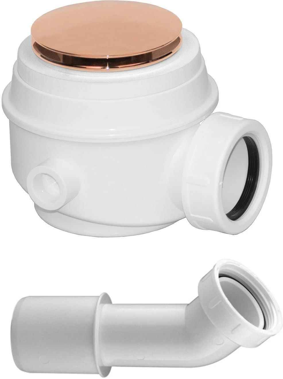 Syfon brodzikowo-wannowy, do brodzików z otworem 50 mm i wanien bez przelewu. Wymiary 7,5 cm / ø 5 cm. Mechanizm klik-klak. W zestawie kolano redukcyjne. Wydajność odpływu 24 l/min. Odejście 4-5 cm, czyszczony od góry, pokrywa mosiężna. Wykończenie: miedź