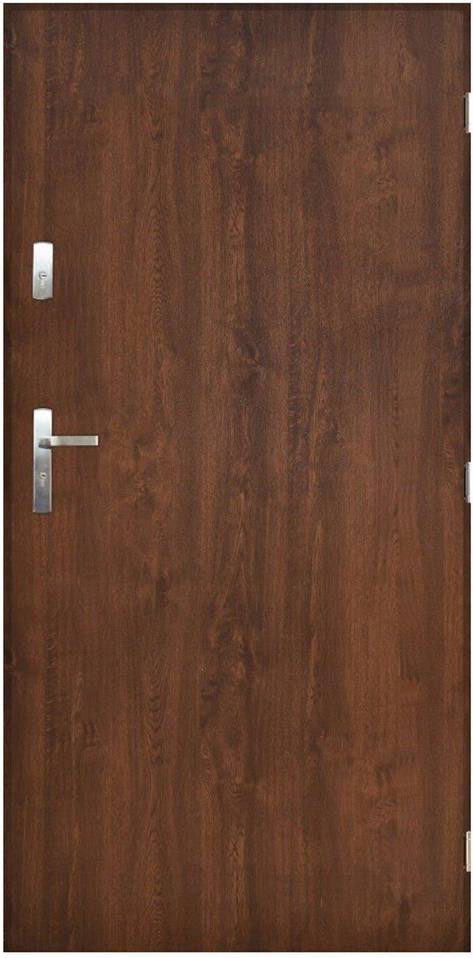 Drzwi zewnętrzne Faro o szerokości 80 cm w kolorze orzech firmy Pantor. Model Faro to drzwi stalowe, przeznaczone do budynków jedno i wielorodzinnych oraz mieszkań. Drzwi wykonane z blachy stalowej ocynkowanej o gr. 0,5 mm lakierowaną w technologii Nano Advance, która zapewnia powierzchnię odporną na promieniowanie UV oraz zarysowania. Skrzydło jest wypełnione polistyrenem ekspandowanym a jego grubość wynosi 55 mm. Wyposażone jest w 3 zawiasy trójdzielne i bolce antywyważeniowe. Współczynnik przenikalności cieplnej to 1,35 W/m2k. Drzwi odporne są na warunki atmosferyczne. W komplecie znajdują się: skrzydło, ościeżnica stalowa ocynkowana lakierowana nano advance łatwa w montażu, klamka, komplet zamków i wkładek, próg aluminiowy, uszczelka, zaślepki, bolce antywyważeniowe. Drzwi polskiej produkcji.