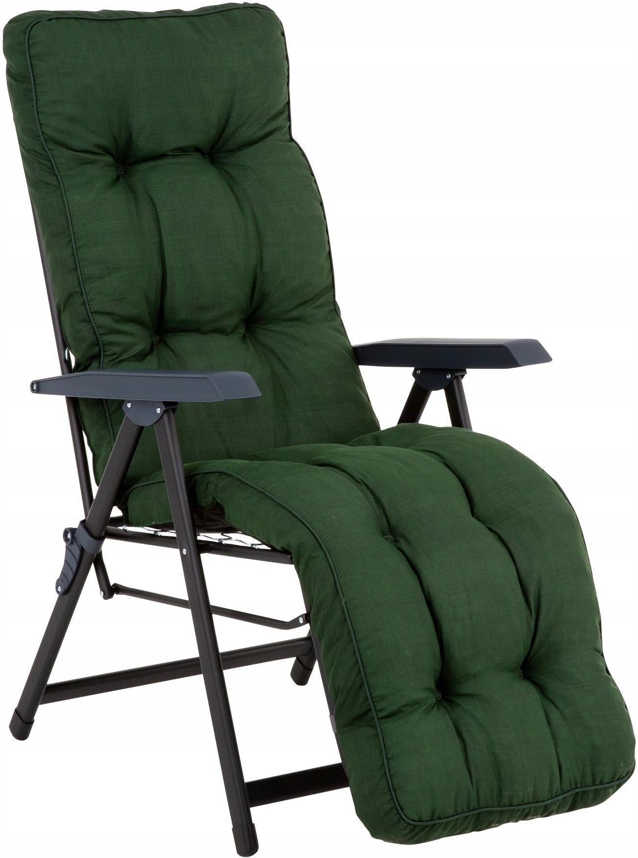 460289 Fotel ogrodowy z podnóżkiem leżak Lena Plus Black Edition PATIO Nasza kolekcja Black Edition przedstawia fotel ogrodowy z podnóżkiem, łączący nowoczesny design z wyjątkową funkcjonalnością. Stelaż fotela, wyposażony w 28-pozycyjny mechanizm z oparciem kwadratowym, wykonany z malowanej proszkowo stali w kolorze czarnym mat, zapewnia wyjątkową odporność na warunki atmosferyczne oraz zarysowania. Matowe wykończenie stelaża doskonale pasuje do minimalistycznych i współczesnych przestrzeni, oferując uniwersalność, która uzupełni każdą aranżację. Komfort siedzenia jest zagwarantowany dzięki pikowanej poduszce typu Box Model, wypełnionej gąbką ciętą flocke, zapewniającej miękkość i wsparcie. Wierzch poduszki z mikrofibry i spód z polipropylenu, połączone pasem tkaniny, nie tylko zwiększają trwałość i łatwość w utrzymaniu czystości, ale także dodają elegancji dzięki poliestrowej lamówce. Praktyczna kieszeń na górnej części oparcia oraz pasek z gumy w dolnej części poduszki zapewniają stabilność i bezpieczeństwo mocowania do stelaża, podnosząc komfort użytkowania. Stelaż:Profil rur: owalny, spawany 36 x 18 mmWymiar po złożeniu: 60 x 25 x 98 cmWymiary rozłożonego produktu szer. 59 x gł. 142-188 x wys. 64-105 cmPoduszka:Wymiary: dł. 150 x szer. 48 x grub. 8 / 10 cmNa leżak pasują poduszki:Lena Plus Marka: Patio Długość [cm]: 80 Szerokość [cm]: 58 Wysokość [cm]: 107 Głębokość [cm]: 80 Kształt: Prostokątne Liczba osób: 1 Kolekcja: Lena Materiał: Mikrofibra,Stal Funkcja: Rozkładane,Z podnóżkiem Maksymalne obciążenie [kg]: 110.000000 Kolor: zielony Wzór: gładki