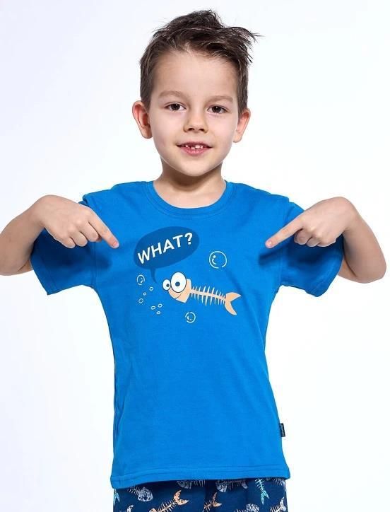 Piżama chłopięca Cornette z krótkim rękawem. Góra piżamy jednolita w kolorze niebieskim, na iersi nadruk, dekolt półokrągły. Spodenki krótkie, wzorowane, w pasie elastyczna gumka. Skład: 100%bawełna