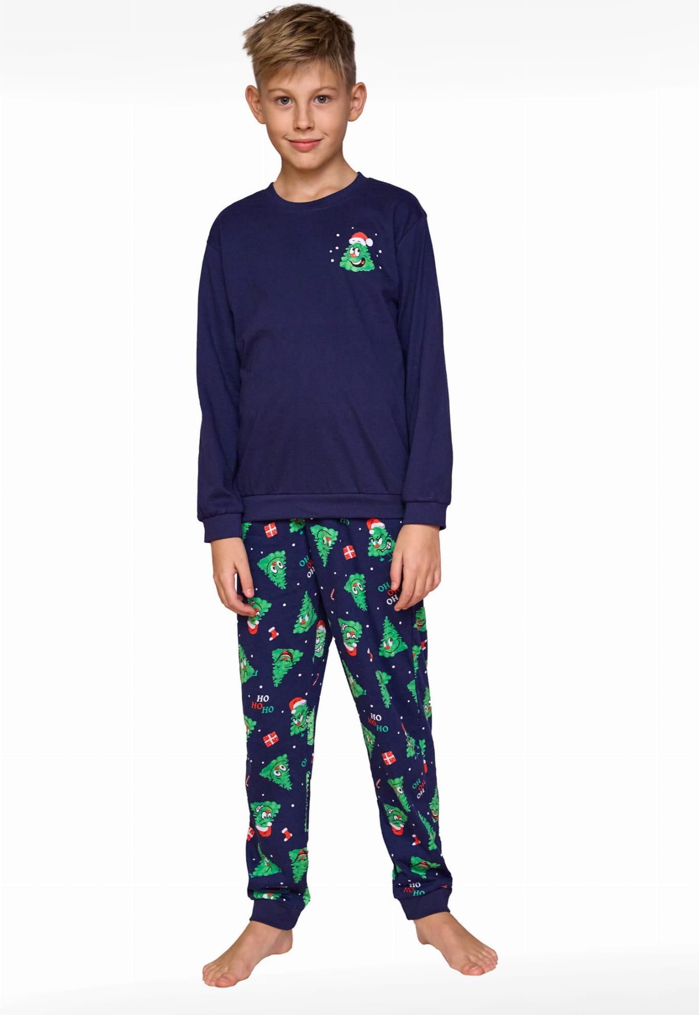 Piżama chłopięca Cornette z motywem Świąt Bożego Narodzenia. Góra piżamy z długim rękawem w kolorze granatowym, dekolt półokrągły, na piersi niewielki nadruk, rękawy zakończone ściągaczem. Spodnie długie z nogawkami zakończonymi ściągaczami, wzorowane z motywem choinek, w pasie elastyczna gumka. Skład: 100% bawełna