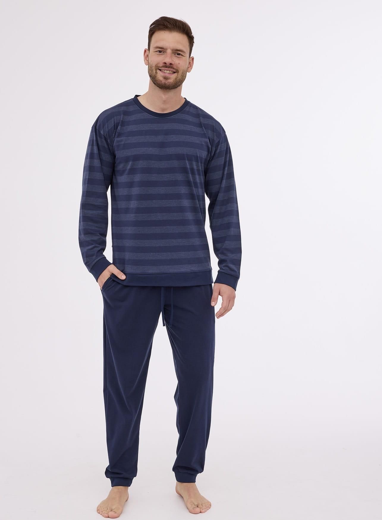 Piżama męska Cornette wykonana z wysokogatunkowej bawełny. Góra piżamy z długim rękawem, mankiety zakończone ściągaczami, dekolt półokrągły, wzorzysta w pasy. Spodnie długie z kieszeniami, jednolite w kolorze grafitowym, w pasie elastyczna gumka oraz troczek, mankiety zakończone ściągaczami. Skład: 100% bawełna