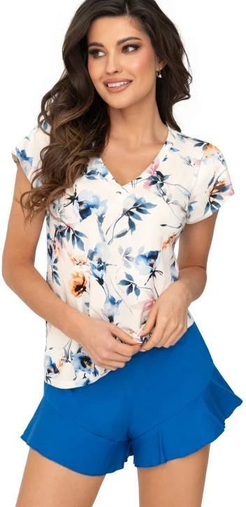 Piżama damska Donna wykonana z miękkiej w dotyku wiskozy. Góra piżamy w kolorze kremowym z nadrukiem motywu kwiatowego. Dekolt w V , rękaw krótki. Spodnie krótkie, jednolite w kolorze chabrowym, nogawki zakończone delikatną falbanką. Skład: 95% wiskoza 5% elastan