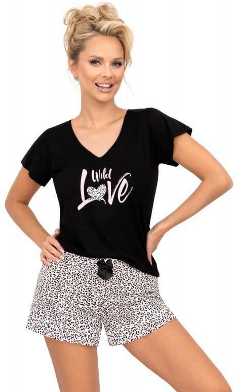 Piżama damska Donna wykonana z wysoko gatunkowej bawełny. Góra piżamy z krótkim rękawem w jednolitym różowym kolorze, dekolt w serek, na piersi nadruk. Spodenki krótkie wzorowane z motywem panterki, w pasie ozdobna satynowa kokardka. Skład: 100% bawełna