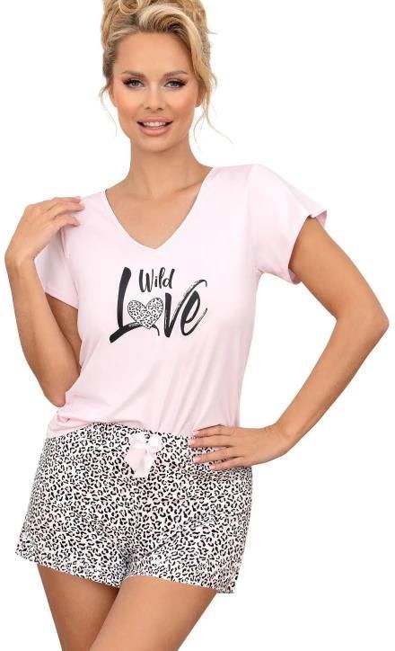 Piżama damska Donna wykonana z wysoko gatunkowej bawełny. Góra piżamy z krótkim rękawem w jednolitym różowym kolorze, dekolt w serek, na piersi nadruk. Spodenki krótkie wzorowane z motywem panterki, w pasie ozdobna satynowa kokardka. Skład: 100% bawełna