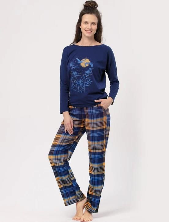 Piżama damska Key z długim rękawem. Koszulka z długim rękawem w kolorze granatowym, na piersi nadruk. Spodnie długie wykonane z bawełny flanelowej, w pasie elastyczna gumka, kieszenie po bokach, mankiety proste. Spodnie w kratę w kolorze granatowo-miodowym z metaliczną nitką. Skład: Koszulka 65% bawełna 35% poliester Spodnie : 100% bawełna