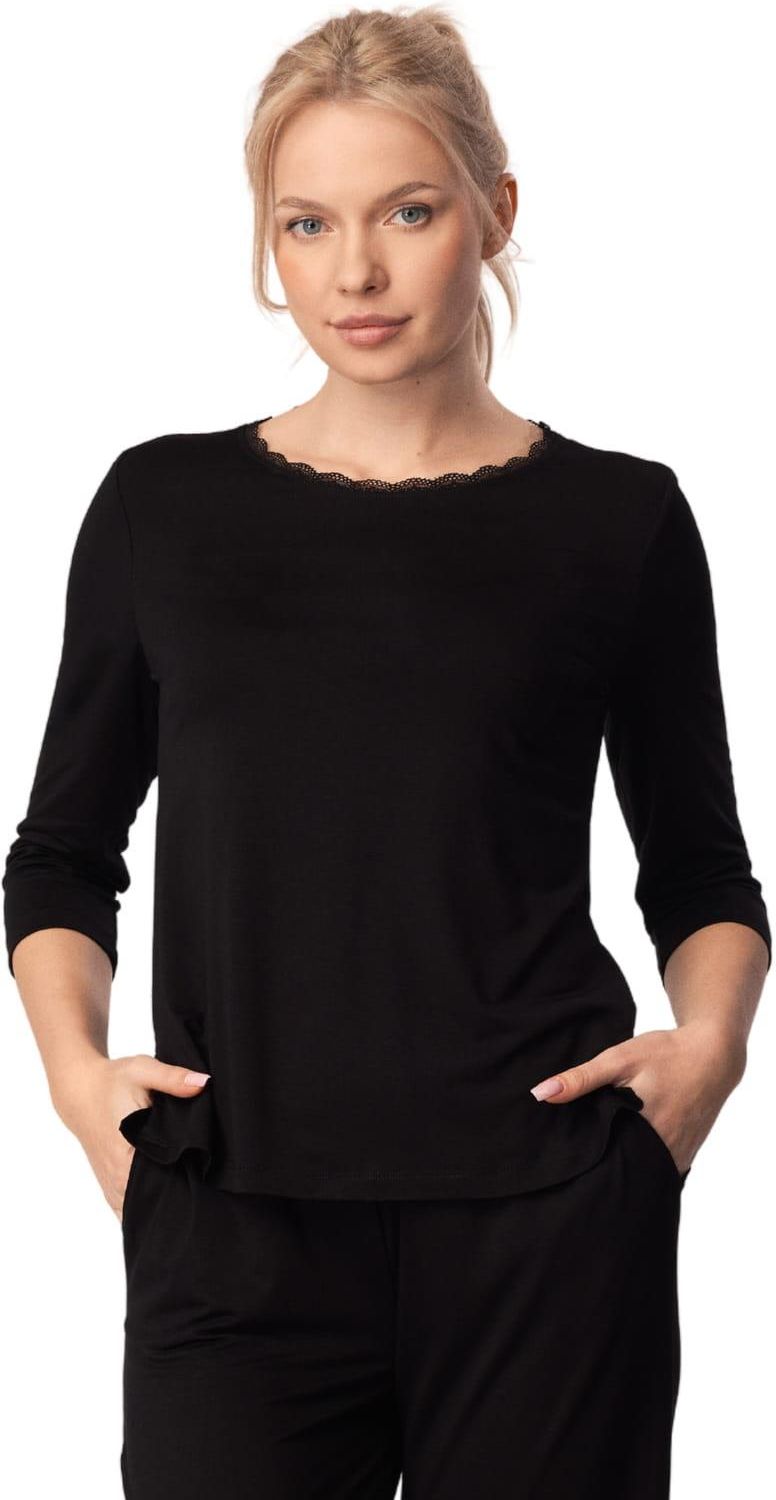 Elegancka piżama damska, wykonana z wiskozy z dodatkiem elastanu. Koszulka gładka w kolorze czarnym. Rękawy o długości 3/4. Dekolt wykończony czarną koronką. Spodnie długie, o luźnym kroju. W pasie wygodna gumka. Skład: 93% wiskoza, 7% elastan.