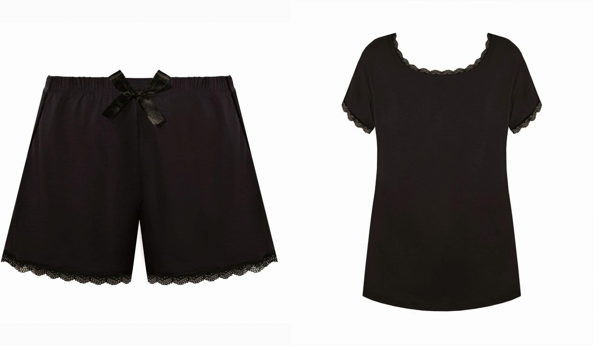Piżama damska z krótkim rękawem i krótkimi spodenkami. Koszulka gładka w kolorze czarnym, rękawy zakończone czarną koronką. Spodenki posiadają satynową kokardkę, nogawki zakończone czarną koronką. Skład: 70% wiskoza, 14% poliamid, 8% elastan, 8% inne