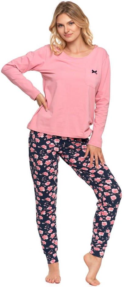Piżama damska z długim rękawem i długimi spodniami, wykonana z bawełny z dodatkiem elastanu. Bluzka w różowym kolorze z ozdobną kieszonką na wysokości piersi. Spodnie długie w kwiatowe wzory, nogawki zakończone ściągaczami. W pasie wygodna gumka. Skład : 95 % bawełna 5 % elastan