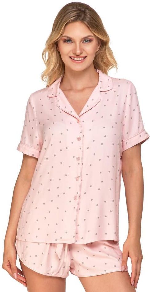 Niezwykle subtelna i elegancka piżama damska Moraj rozpinana z wiskozy., która jest niezwykle miękka w dotyku i oddychająca. Góra piżamy rozpinana na całej długości, posiada kołnierzyk obszyty lamówką, krótki rękaw. Spodenki krótkie, w pasie elastyczna gumka oraz regulacja. Całość utrzymana w kolorze pastelowego różu w szare kropeczki. Skład: 100% wiskoza